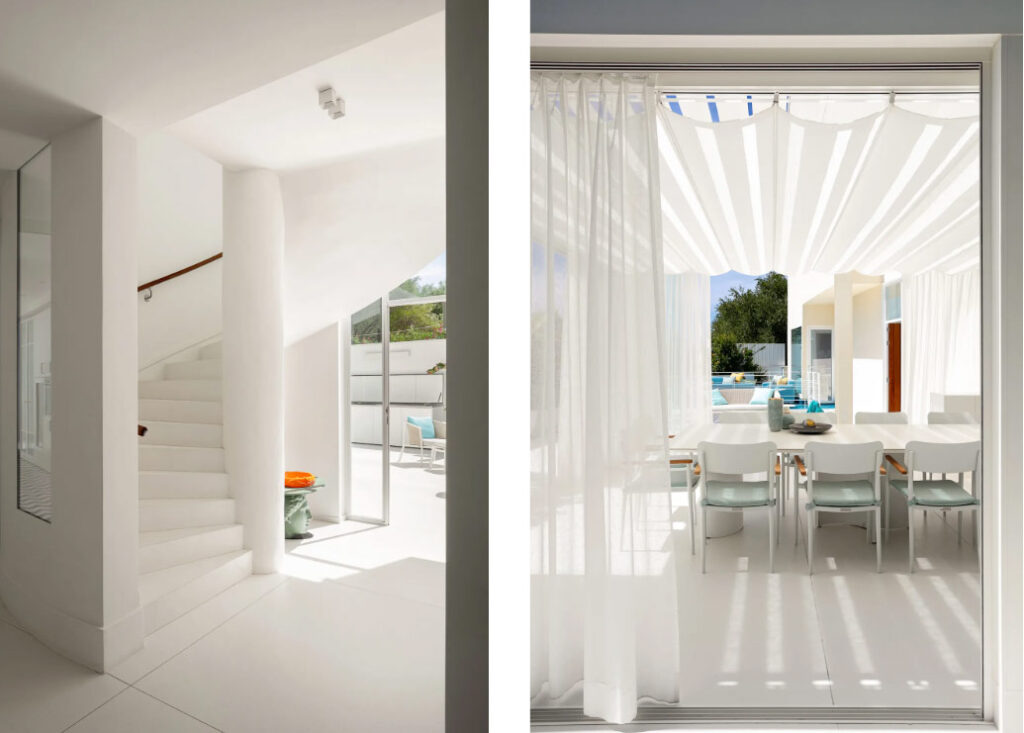 L’importanza della contestualizzazione paesaggistica nel parco del Cilento e gli importanti interventi architettonici, hanno reso fondamentale l’apporto professionale anche dell’architetto senior di nabi.interior design, Stefania Ugliano. Qui, il mood total white, come amano definirlo i progettisti, viene interrotto con decise e nette intromissioni di blu, gialli e verdi, che riportano in casa tutti i colori di questo territorio e confermano la cifra stilistica di Biancamaria. Che, ricordiamo essere originaria proprio di queste zone. «Per le pavimentazioni esterne e interne ho scelto del laminam ardesia bianco, che mi ha permesso allo stesso tempo di avere funzione ed estetica, intervallato dai vivaci colori turchese e azzurro dei pavimenti Arcea nel terrazzo e nella zona cucina». Anche la zona dedicata ai bagni, realizzata con Cotto Vietri, è un chiaro omaggio alla tradizione campana dello smalto e della riggiola – nome napoletano delle piastrelle maiolicate – ma con accostamenti azzardati nei colori.