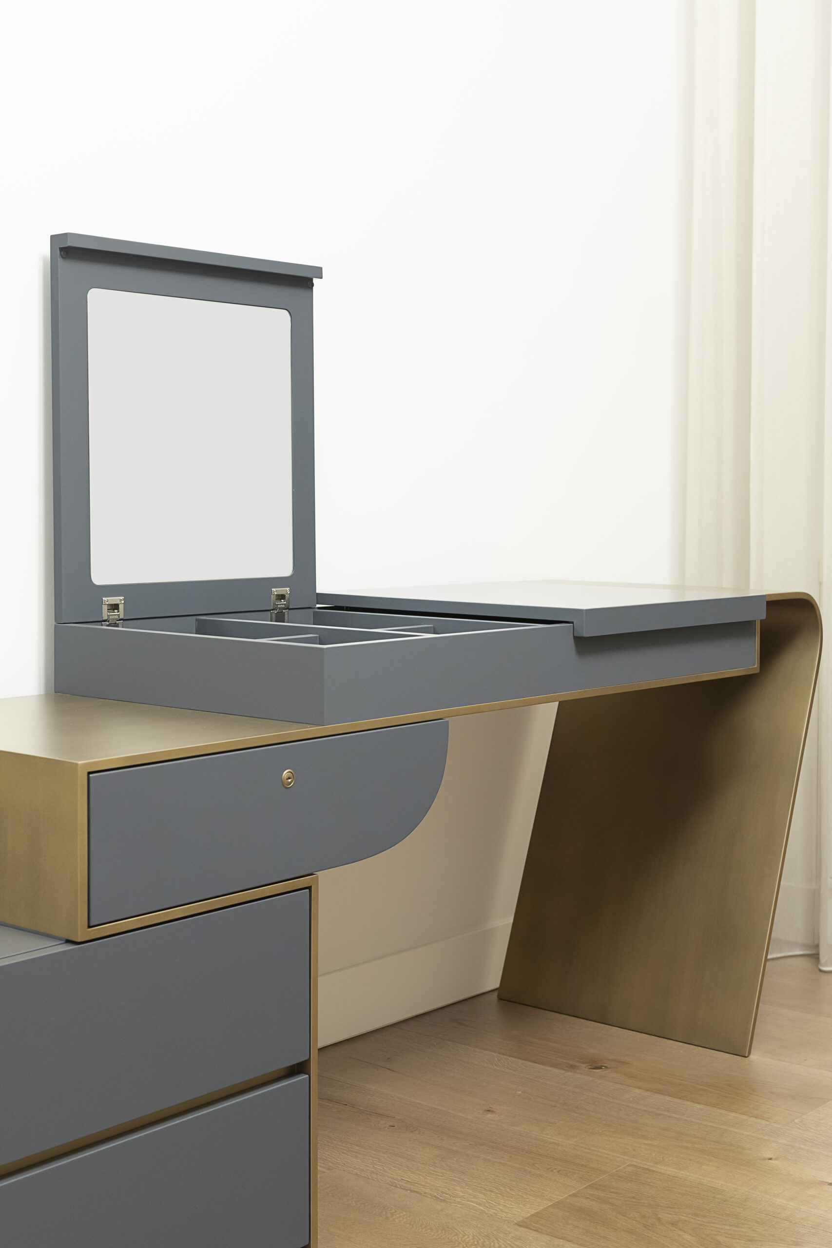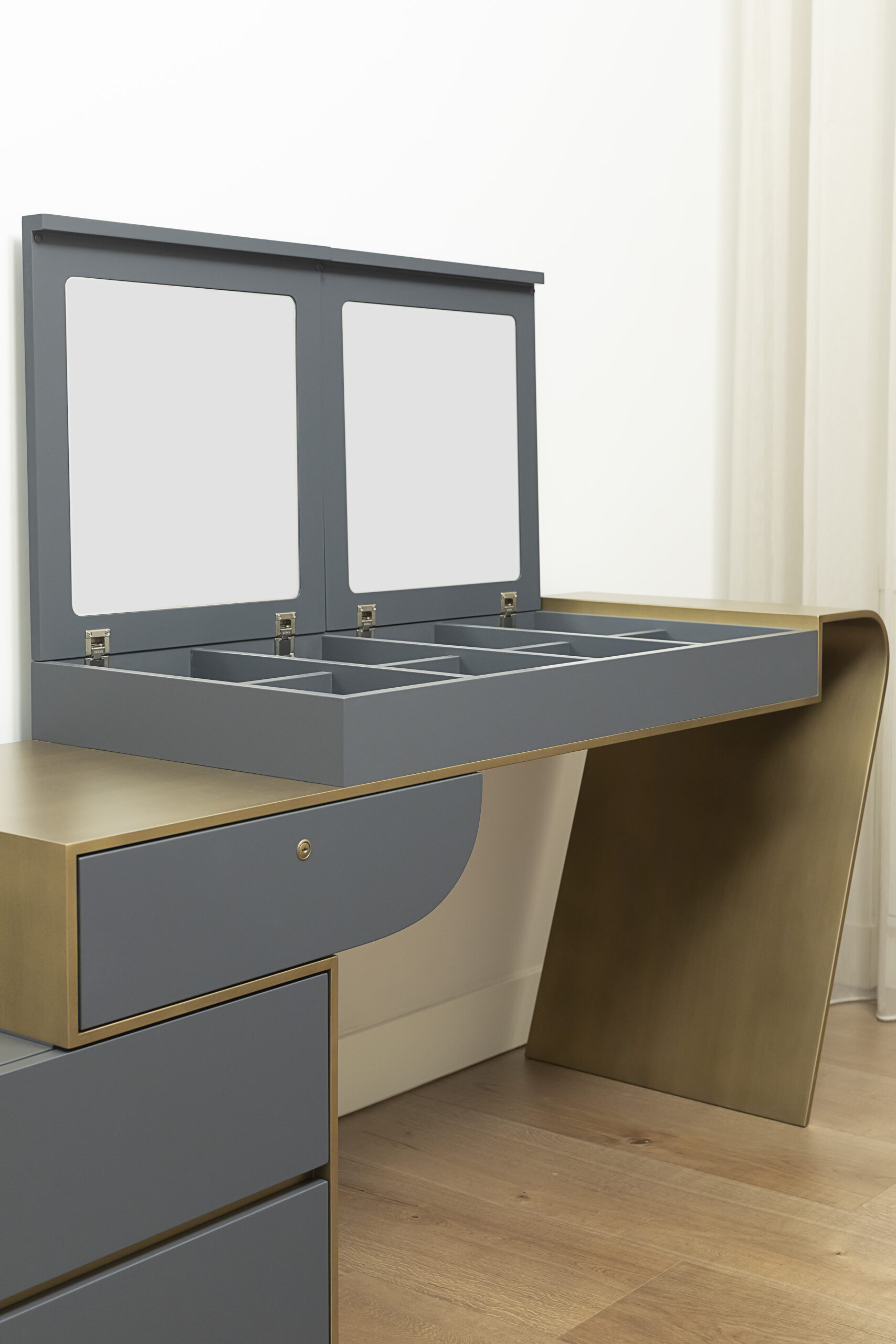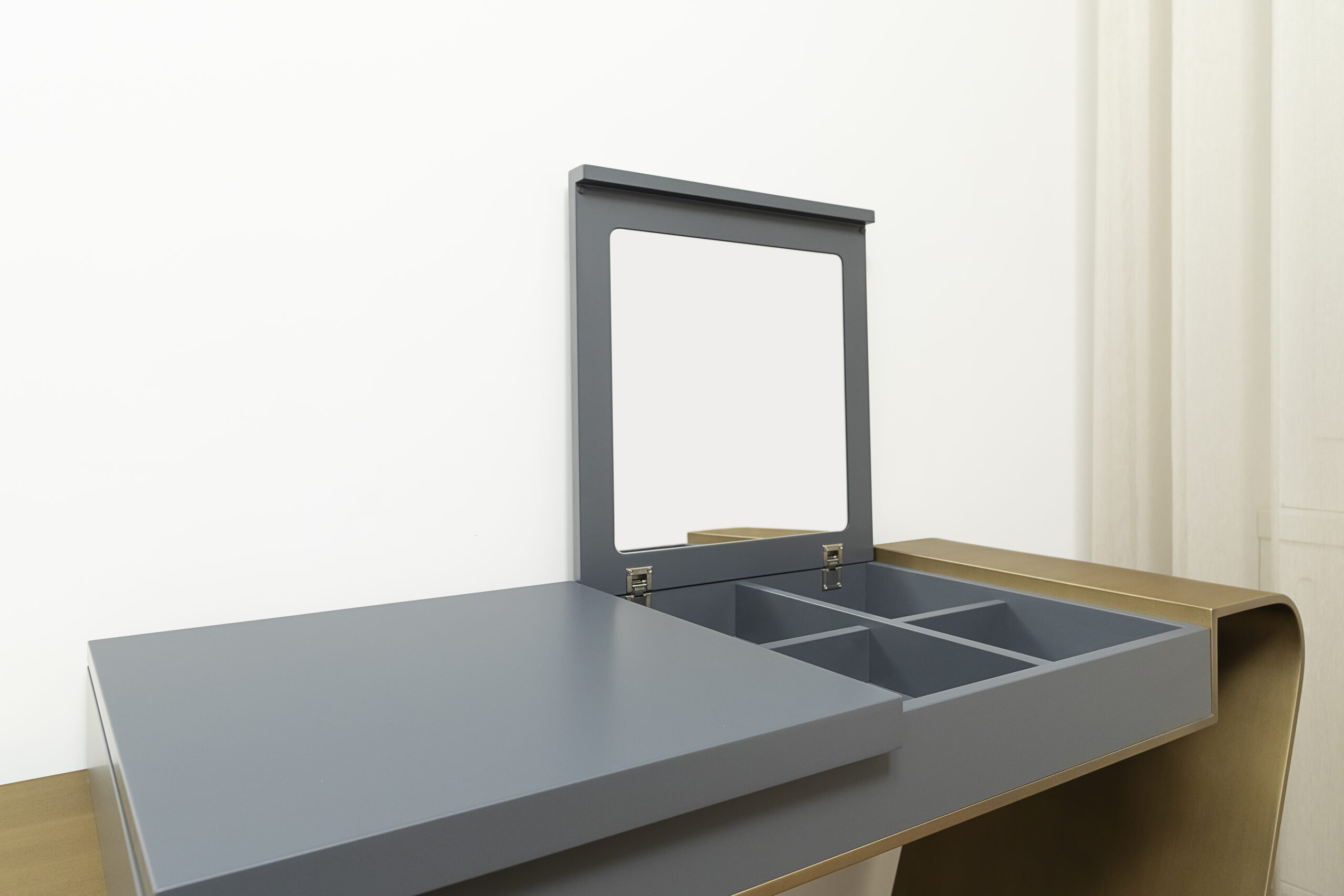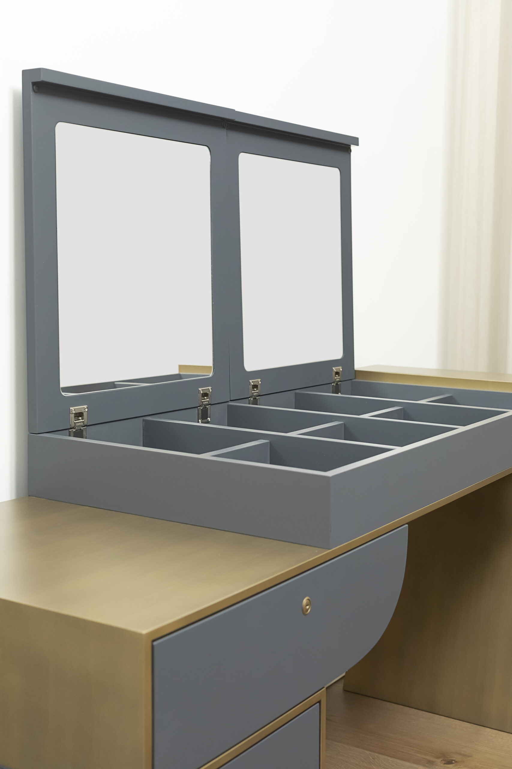 La gamba esile ed elegante sostiene il corpo funzionale di questo mobile, pannelli apribili che contengono spazio organizzato per il trucco o per accessori personali oltre specchi. Il modulo laterale completa il contenimento ma può funzionare da comoda panca per una master bad o per una comoda zona toilette.