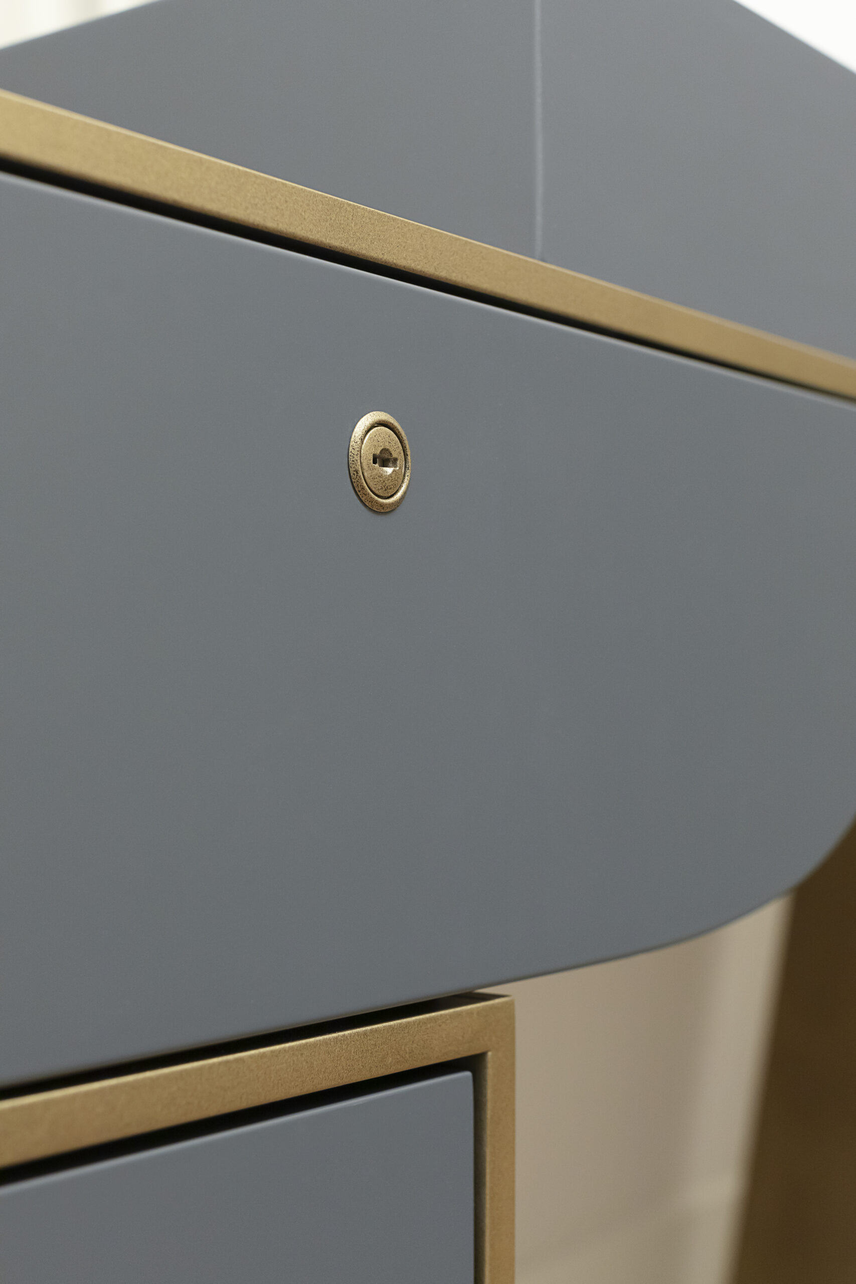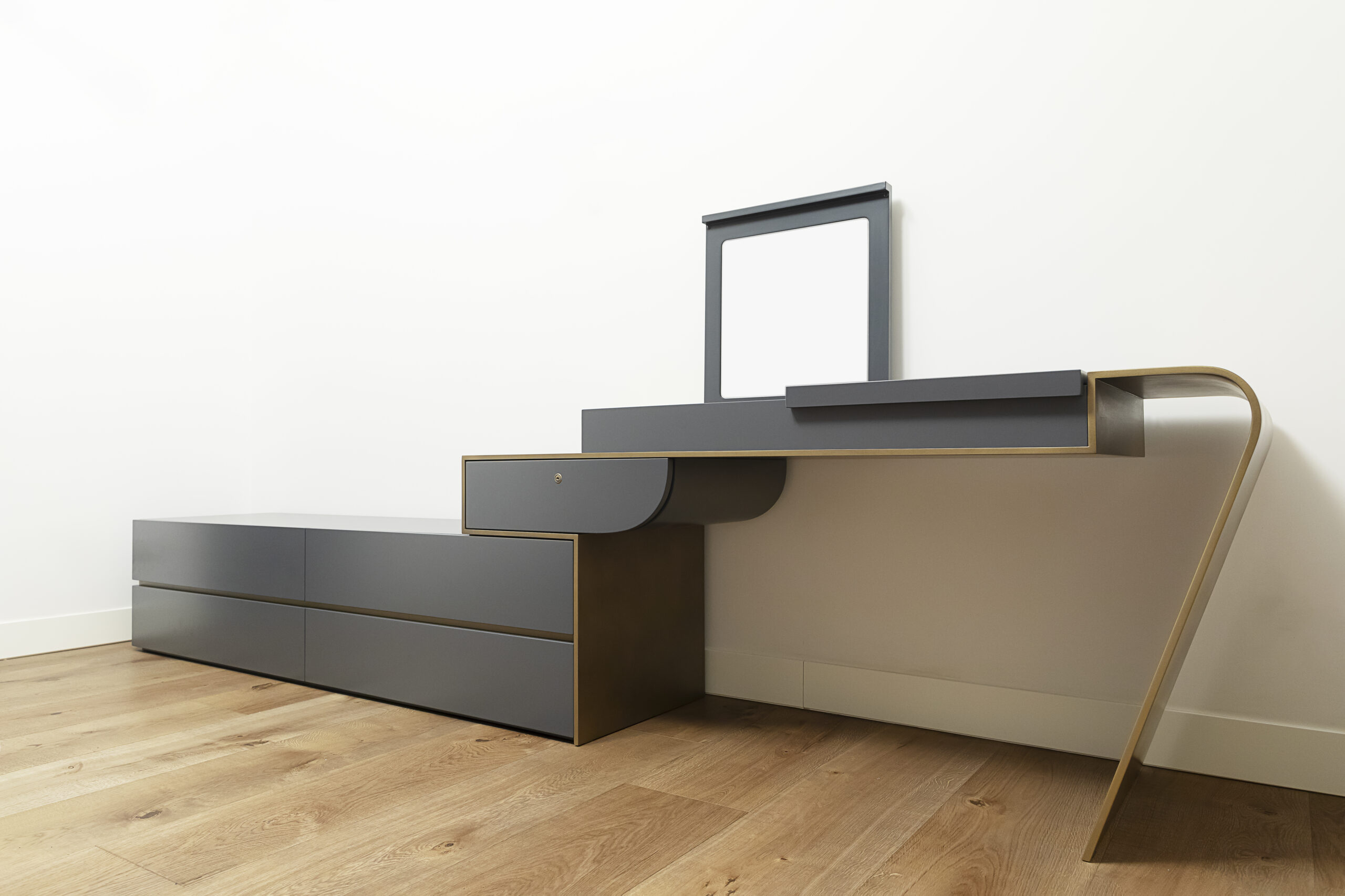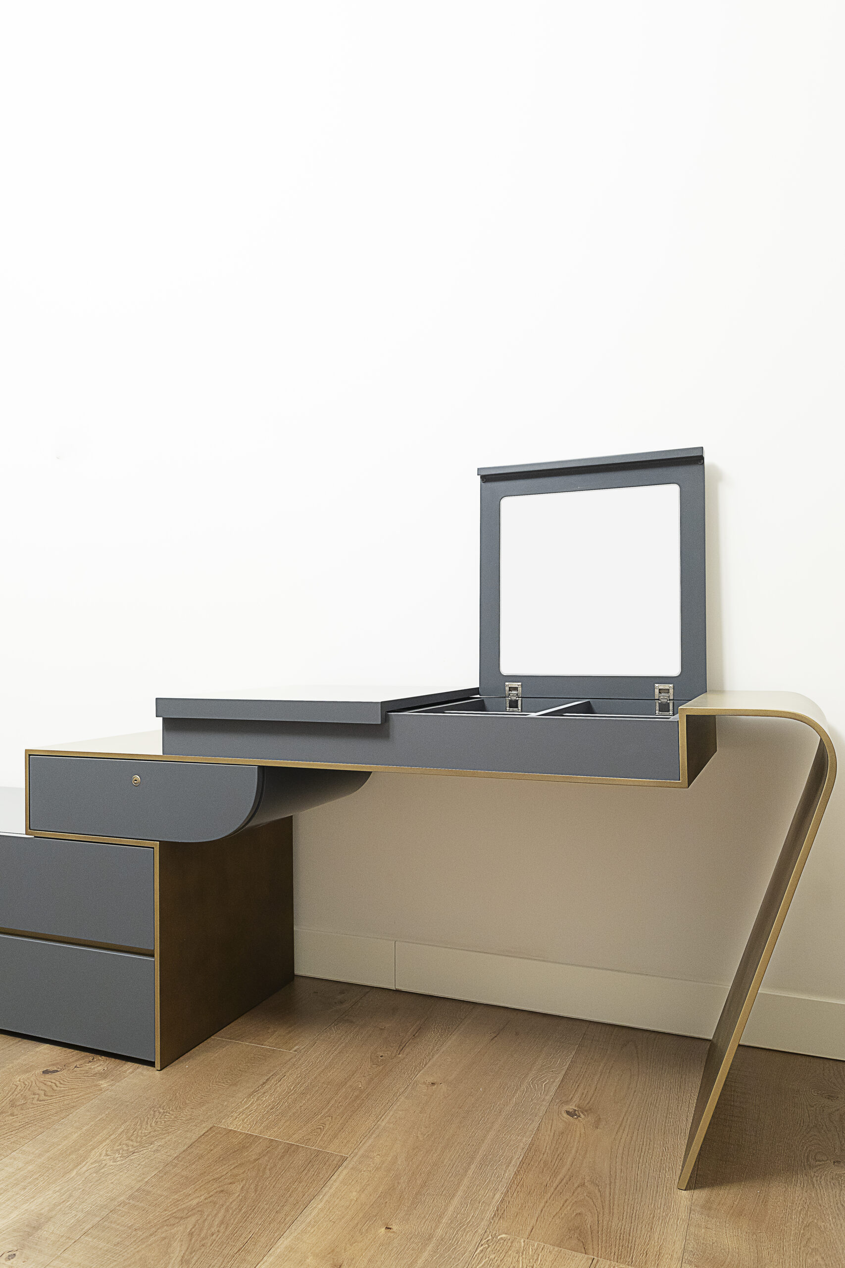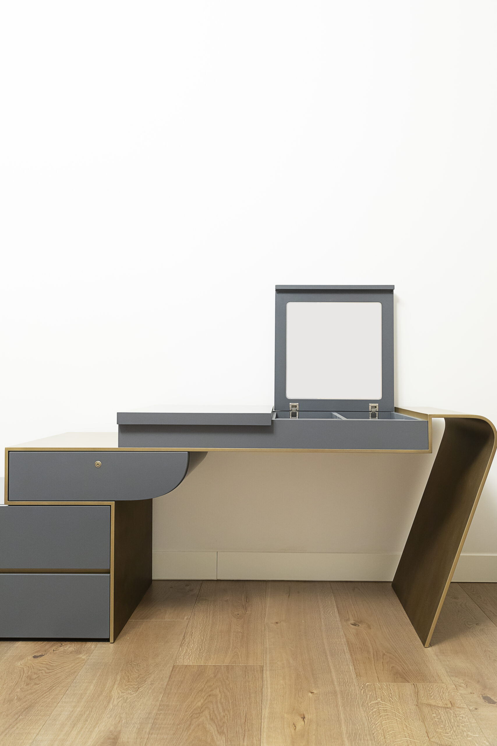 La gamba esile ed elegante sostiene il corpo funzionale di questo mobile, pannelli apribili che contengono spazio organizzato per il trucco o per accessori personali oltre specchi. Il modulo laterale completa il contenimento ma può funzionare da comoda panca per una master bad o per una comoda zona toilette.