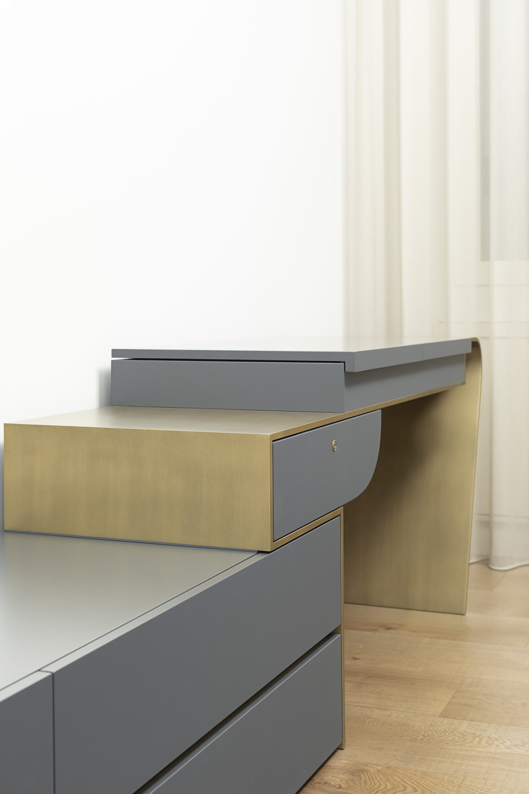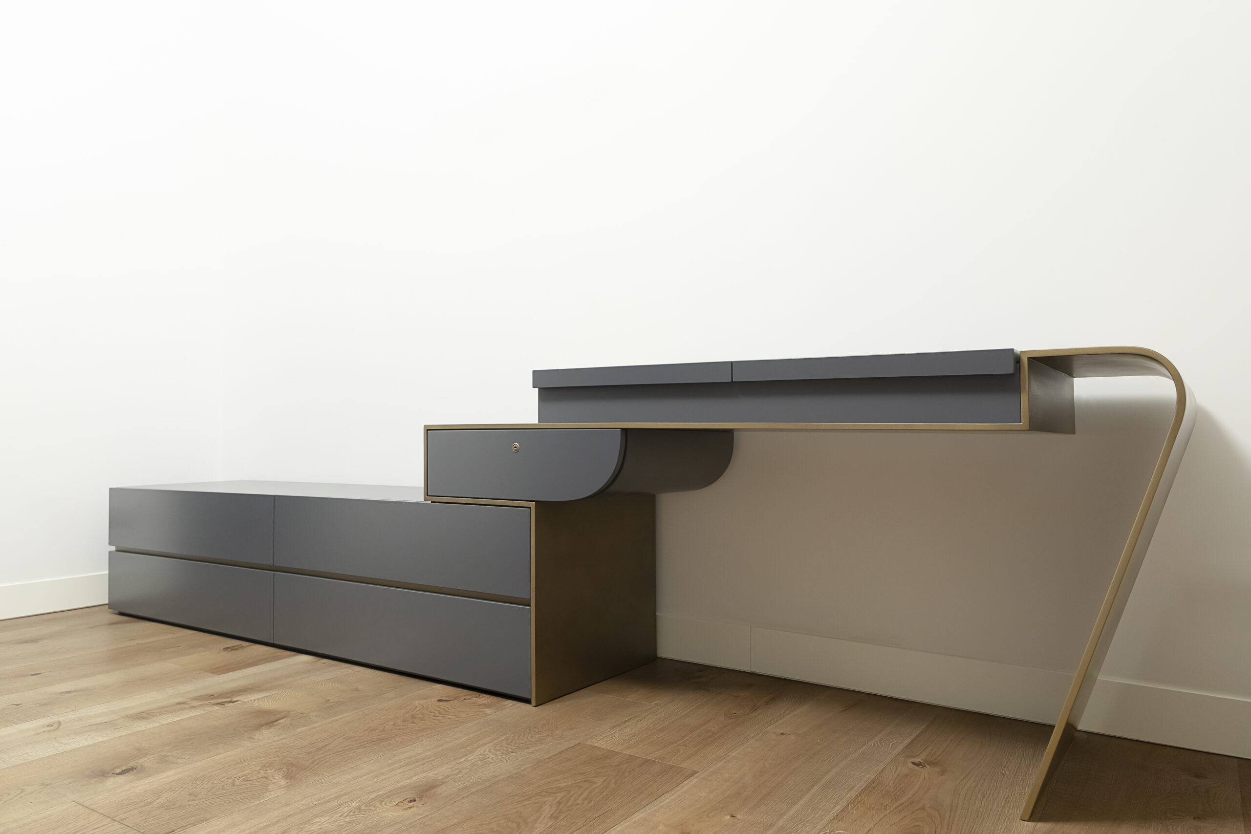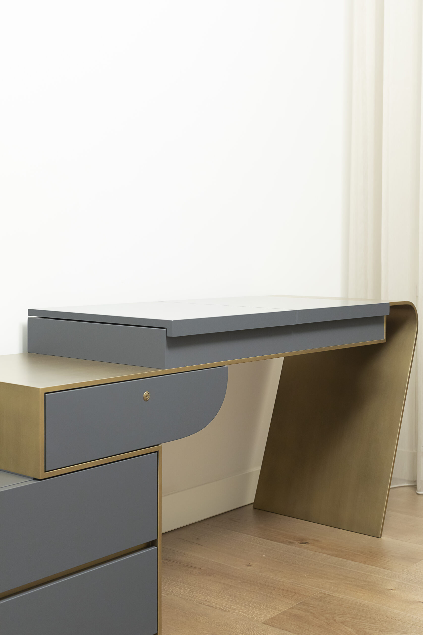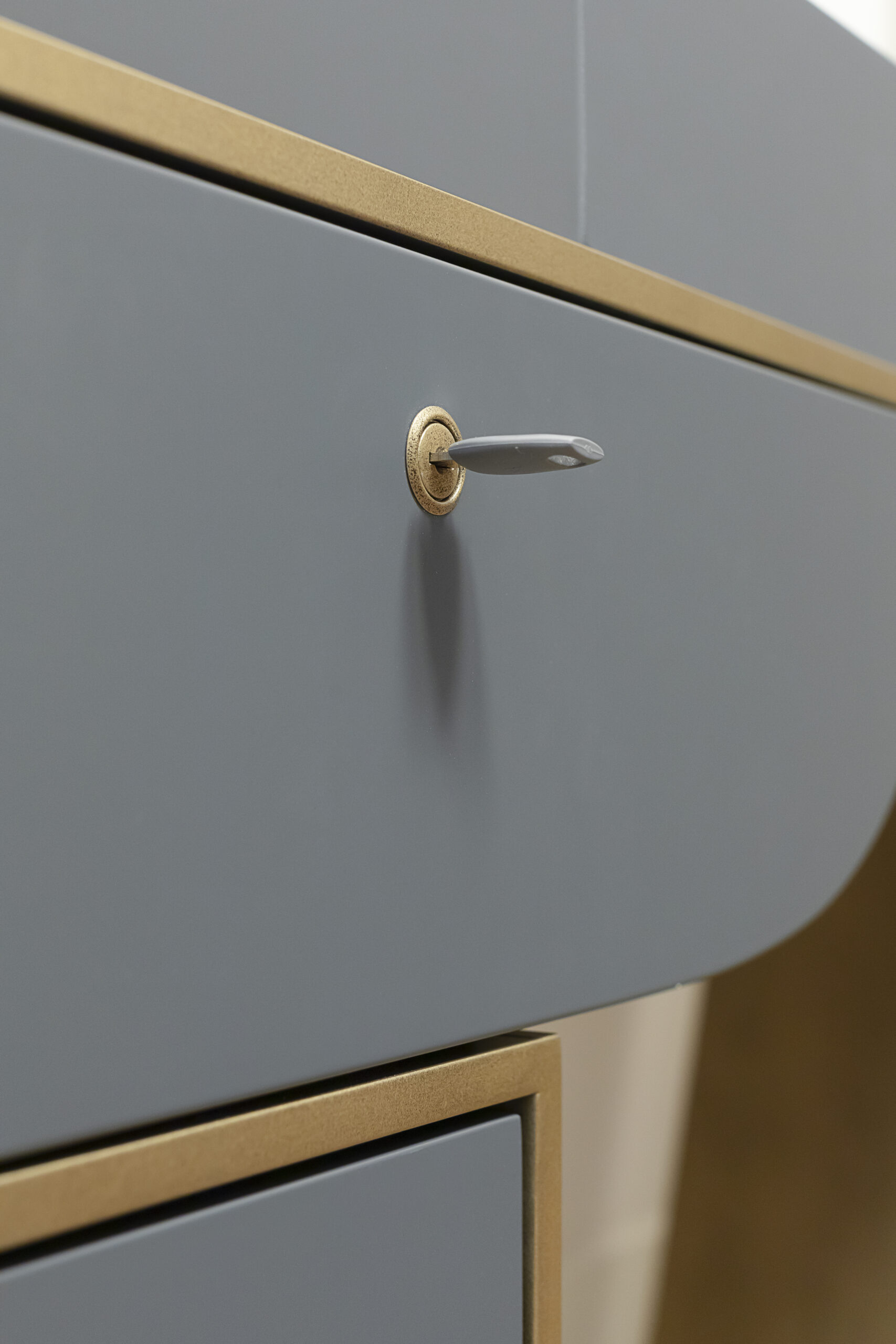 La gamba esile ed elegante sostiene il corpo funzionale di questo mobile, pannelli apribili che contengono spazio organizzato per il trucco o per accessori personali oltre specchi. Il modulo laterale completa il contenimento ma può funzionare da comoda panca per una master bad o per una comoda zona toilette.