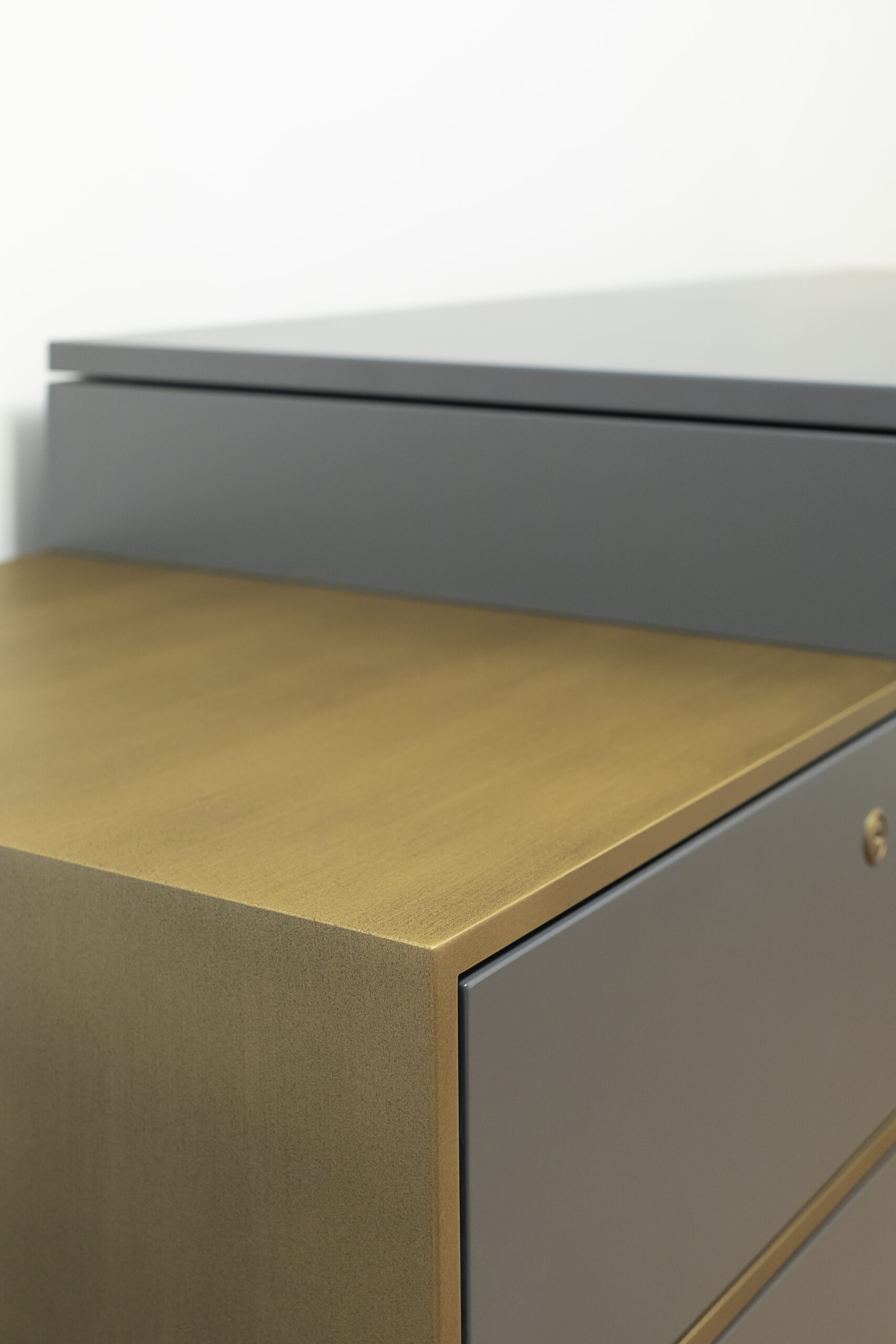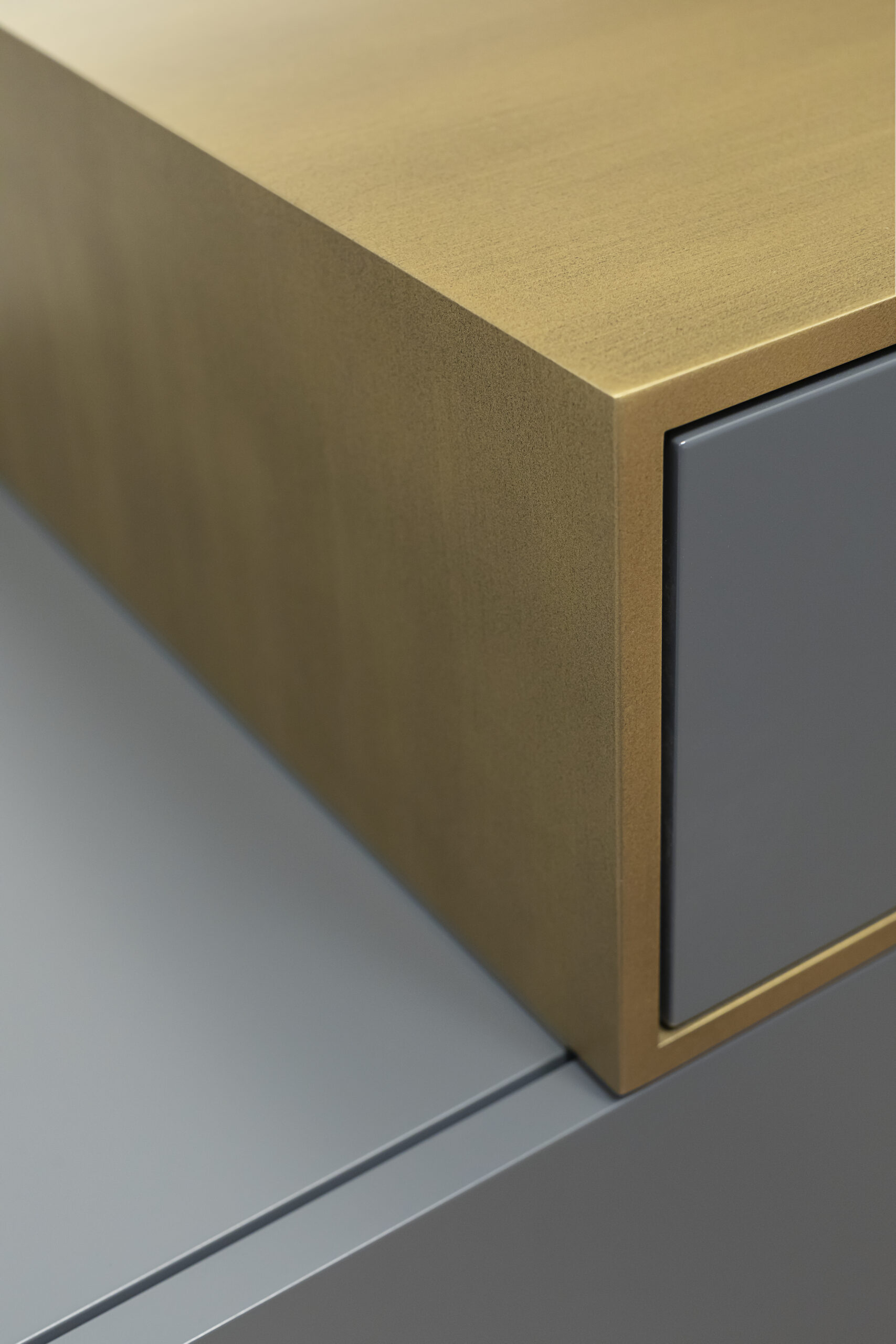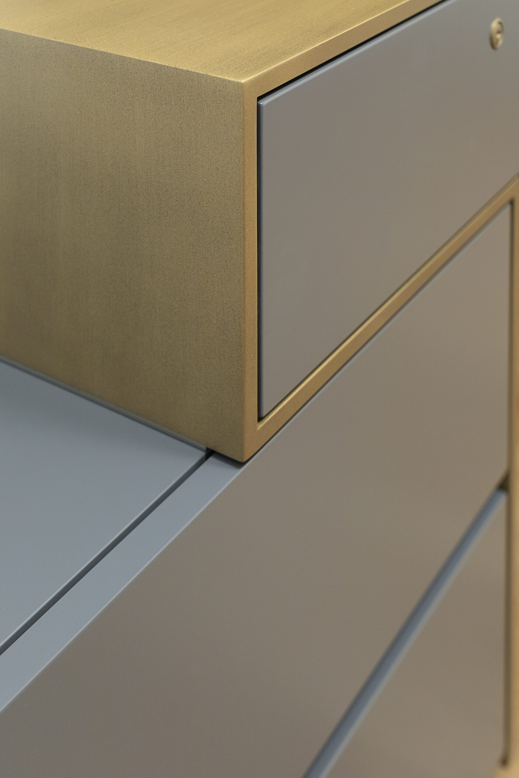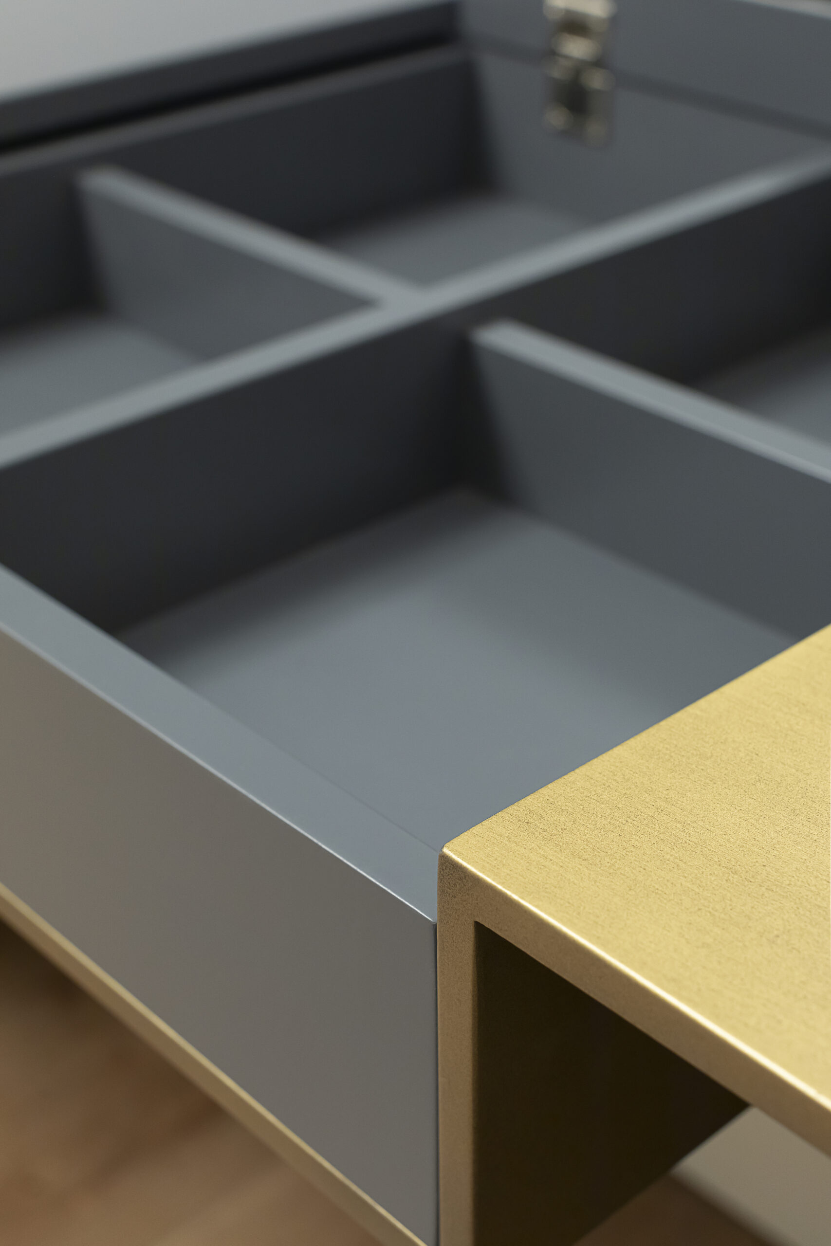 La gamba esile ed elegante sostiene il corpo funzionale di questo mobile, pannelli apribili che contengono spazio organizzato per il trucco o per accessori personali oltre specchi. Il modulo laterale completa il contenimento ma può funzionare da comoda panca per una master bad o per una comoda zona toilette.