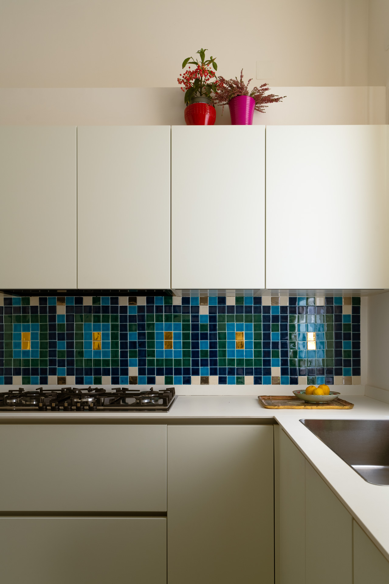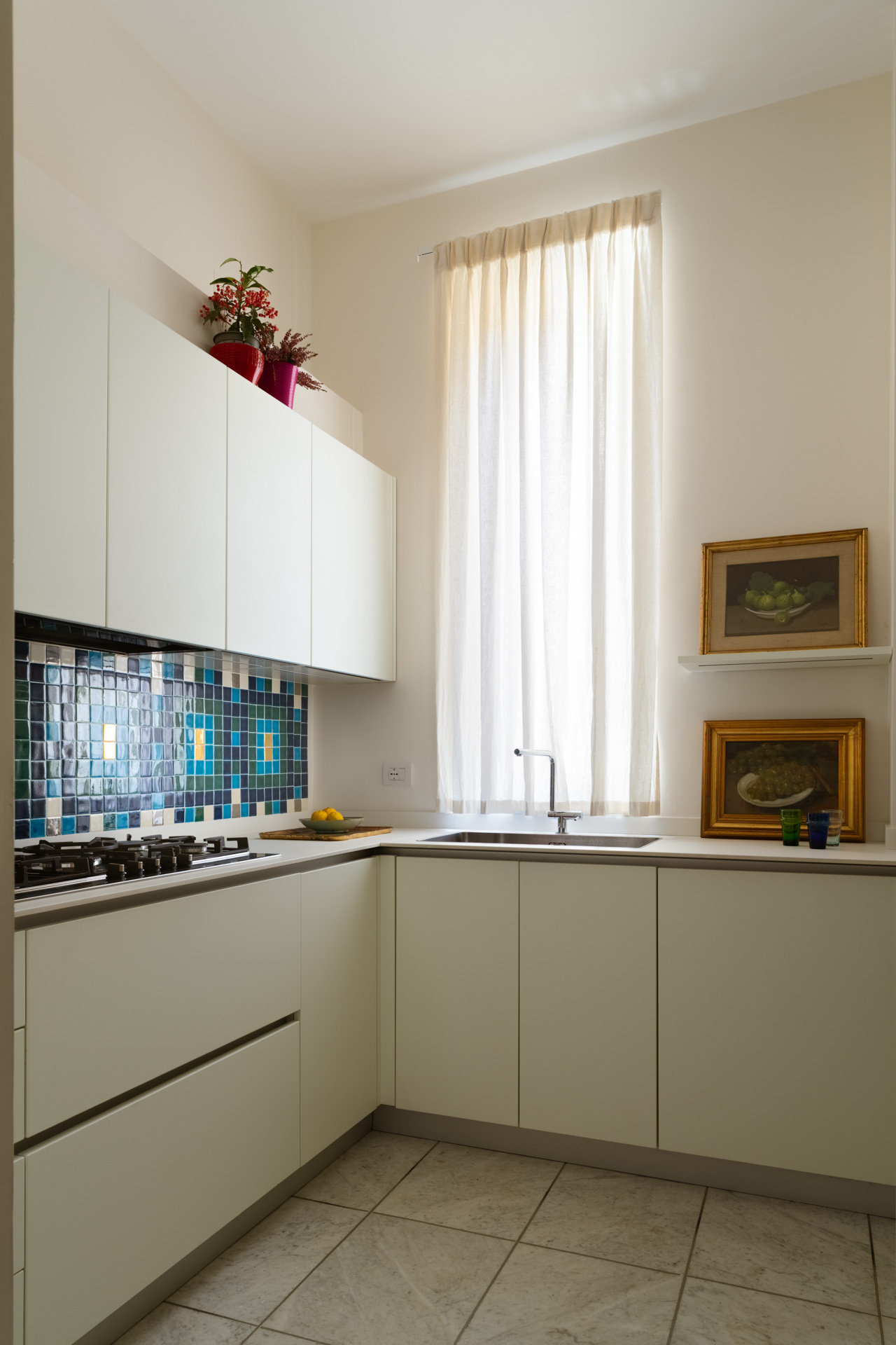 La cucina modificata radicalmente diventa un luogo funzionale per organizzazione e colore total white, ma non poteva mancare l’esplosione dei colori della mattonelle Cottovetri, è qui si unisce la tradizione napoletana allo stile marocchino.