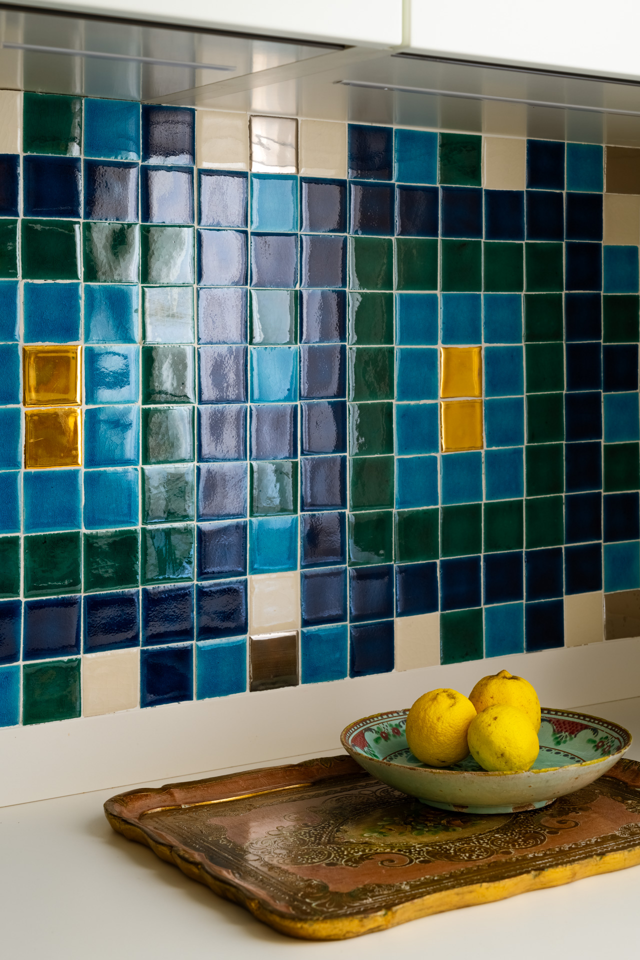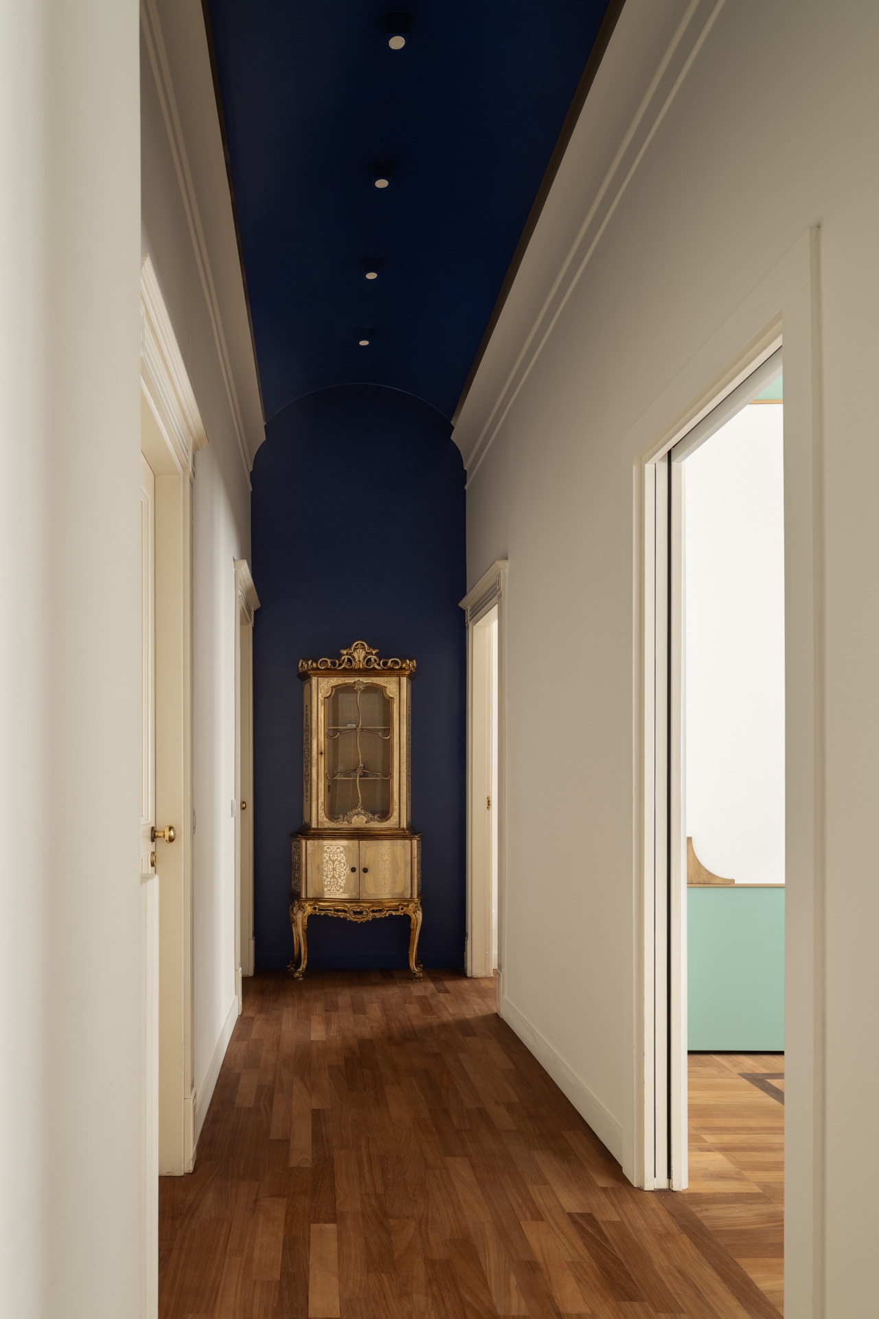 Il viaggio nei sentimenti continua non solo perché la cucina è il luogo per eccellenza delle famiglie napoletane dove ritrovarsi e condividere, ma perché l’architetto Stefania Ugliano, mente logica e tecnica della nabi, in questa occasione ha dato sfogo alla sua creatività nella composizione artistica delle mattonelle e del corridoio con la volta blu, che diventa anche sfondo del mobile di antiquariato ci porta nella zona notte.