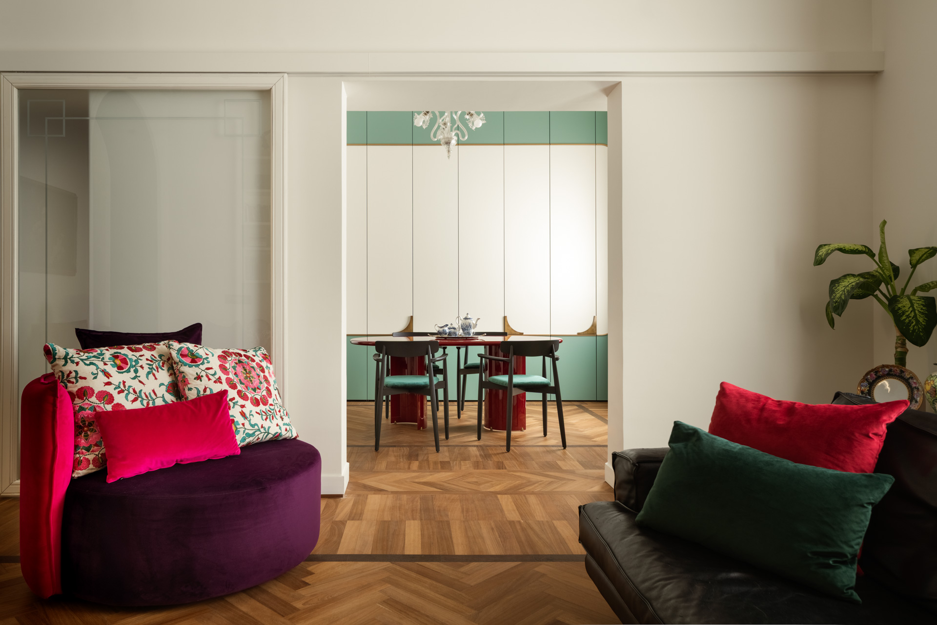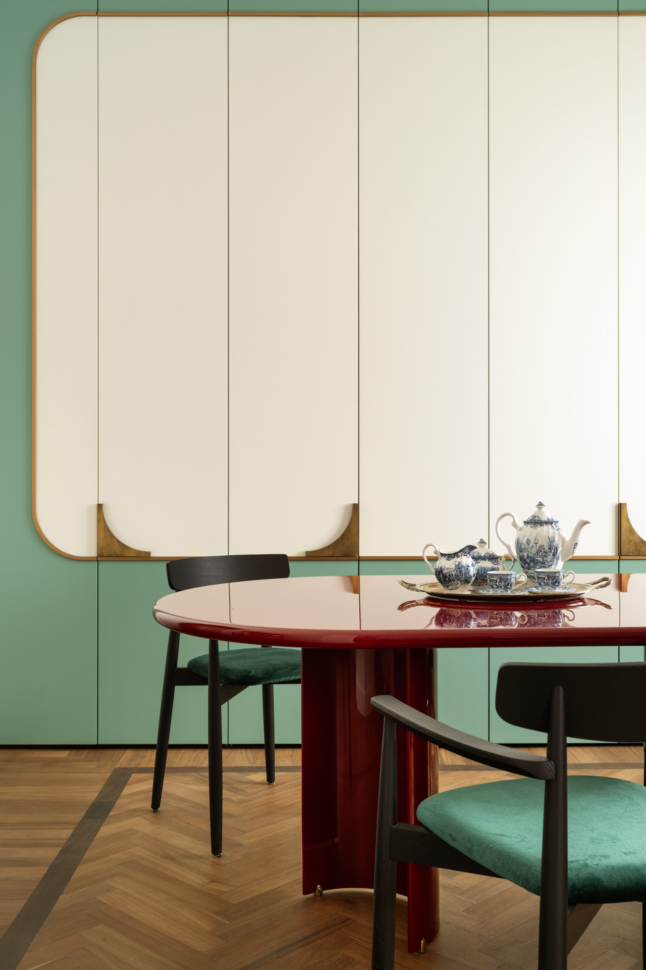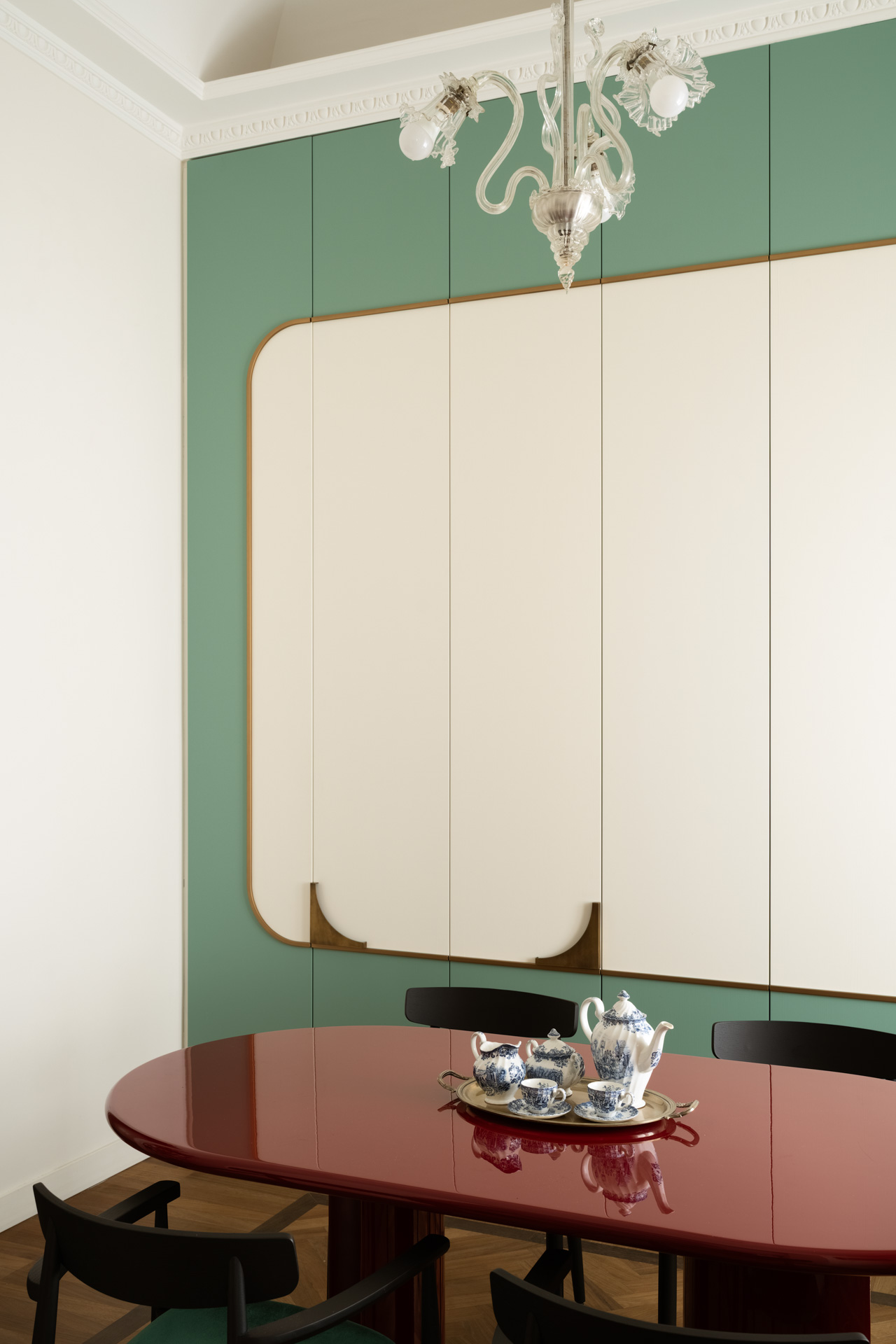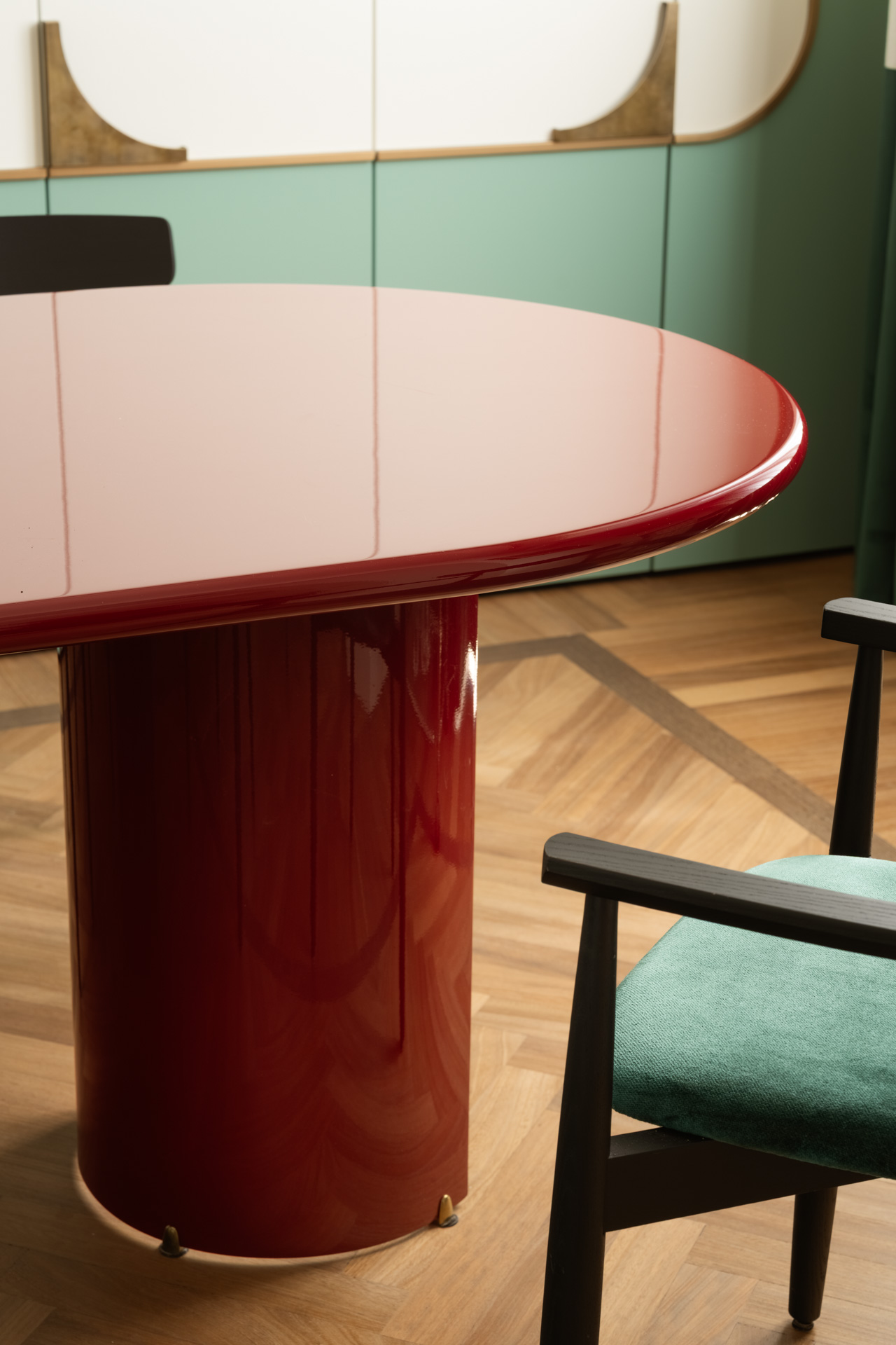 Una porta in stile francese apre alla zona pranzo, una completa espressione dello stile progettuale di Biancamaria: un richiamo a Parigi con colori azzardati, miscele di materiali e l’esclusiva boiserie che nasconde e risolve con eleganza l’esigenza di contenere, il tavolo della collezione Circular nabi.collection dal colore ciliegia, progettato e disegnato da Biancamaria Santangelo.