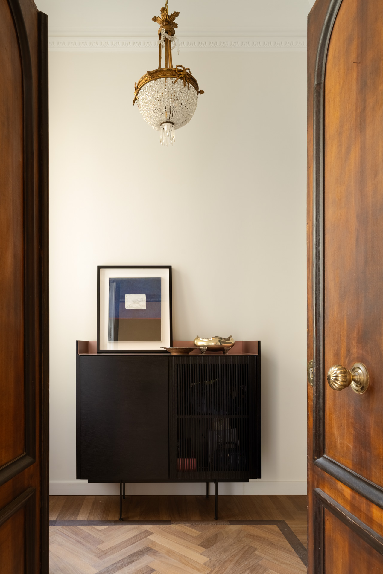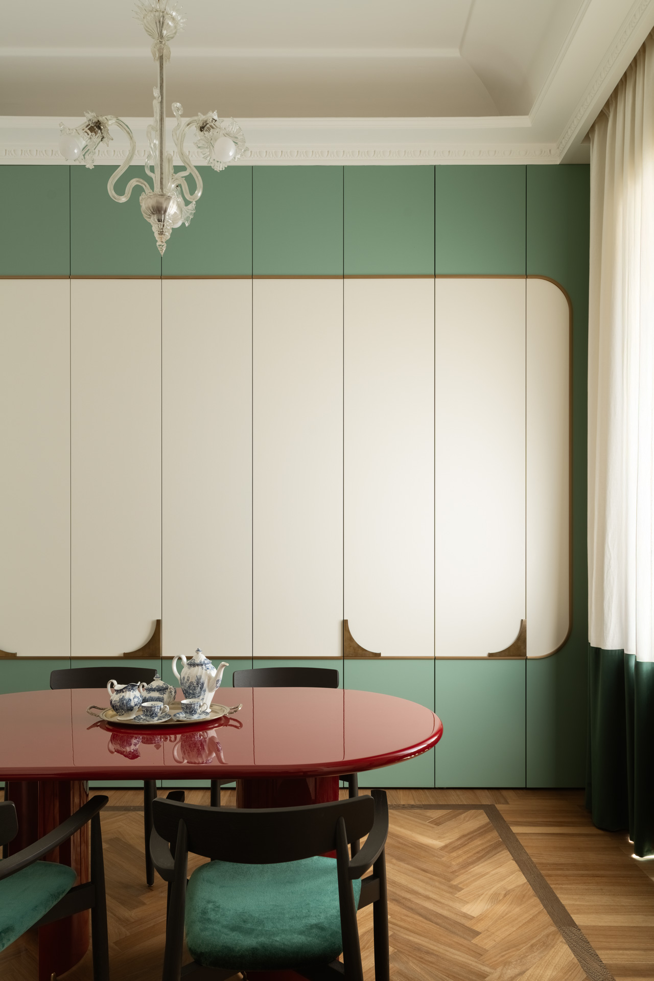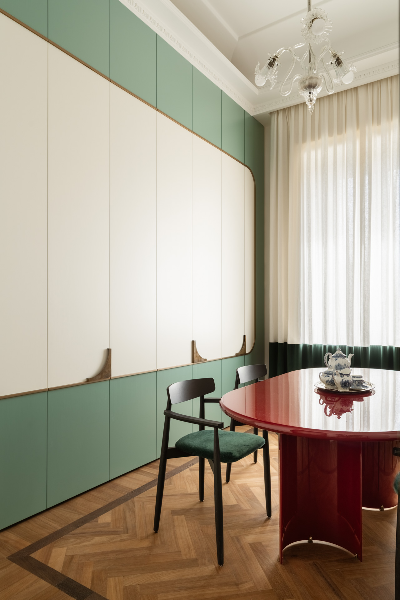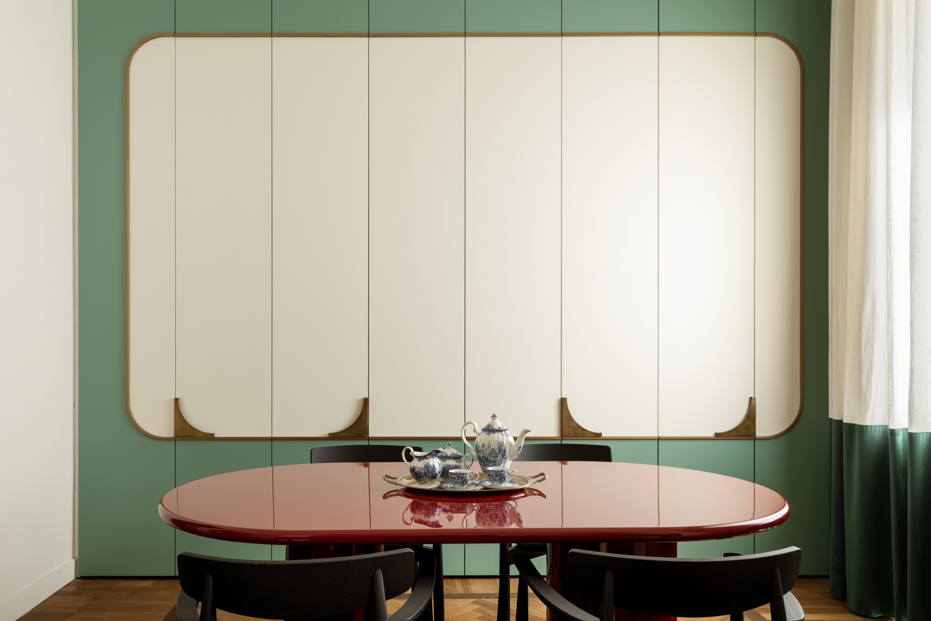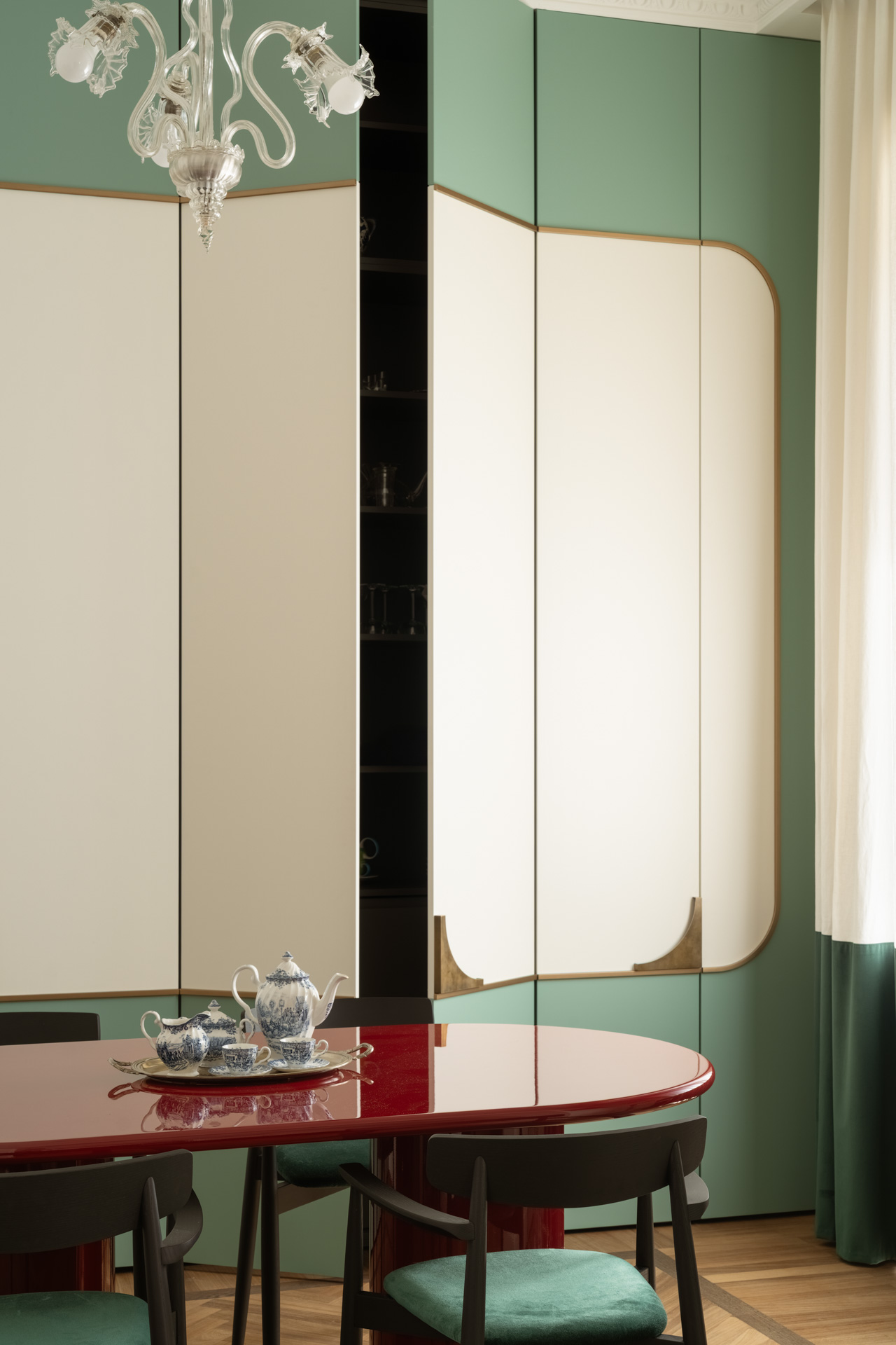 Una porta in stile francese apre alla zona pranzo, una completa espressione dello stile progettuale di Biancamaria: un richiamo a Parigi con colori azzardati, miscele di materiali e l’esclusiva boiserie che nasconde e risolve con eleganza l’esigenza di contenere, il tavolo della collezione Circular nabi.collection dal colore ciliegia, progettato e disegnato da Biancamaria Santangelo.