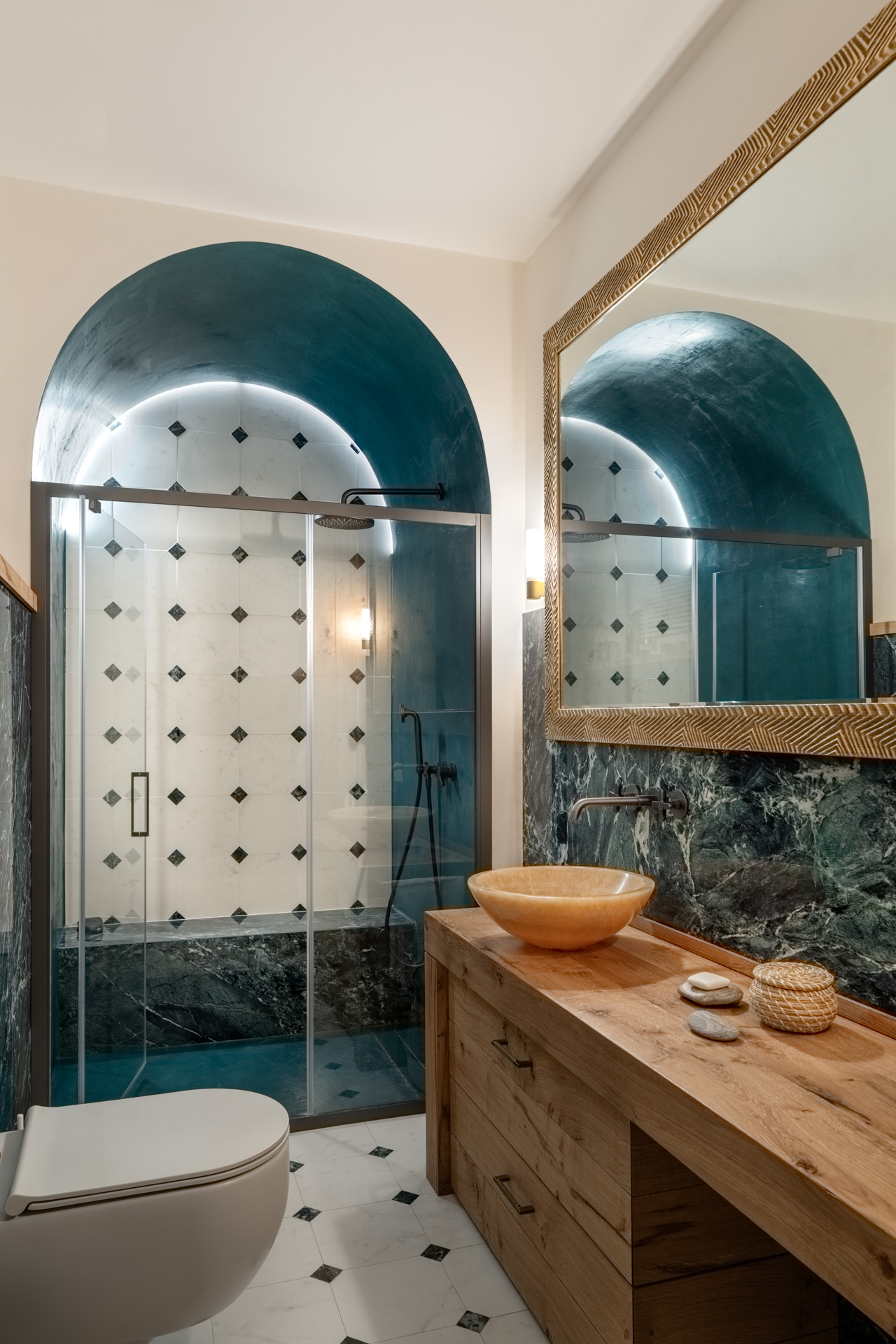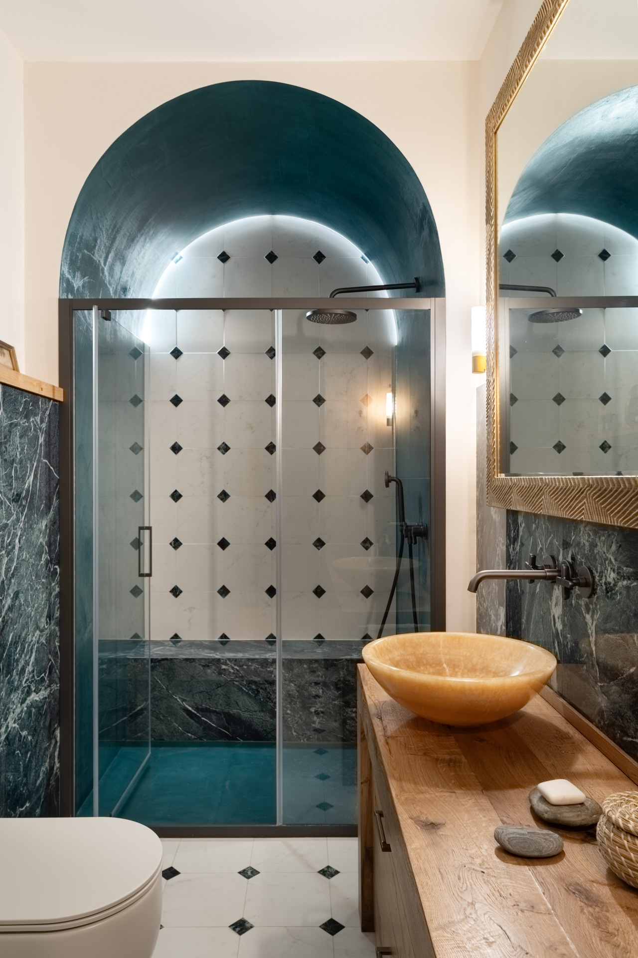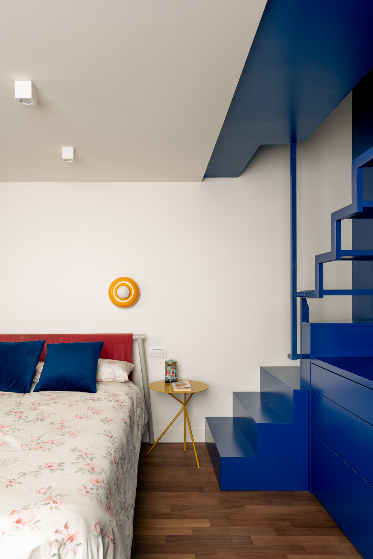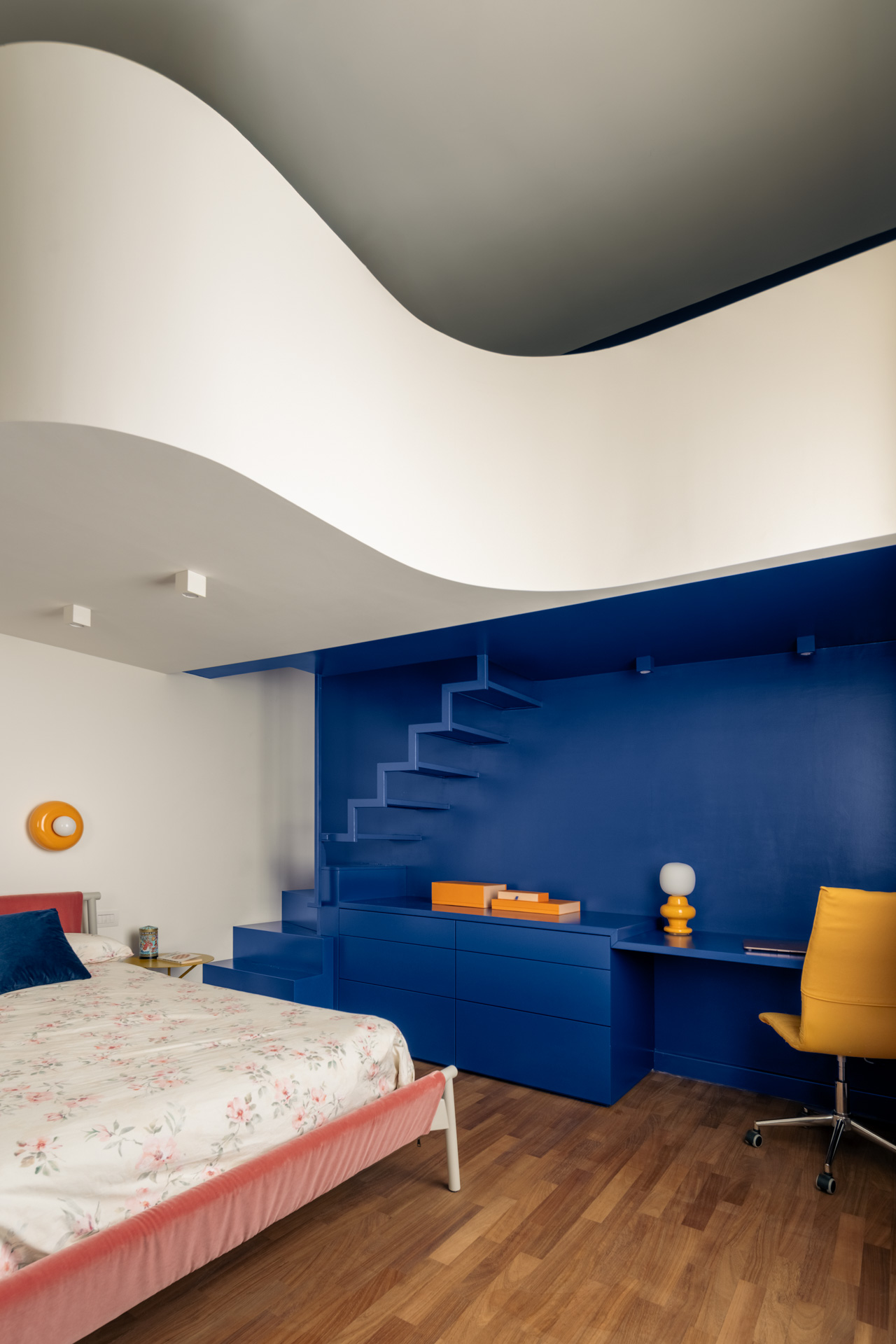 La prima camera da letto è un omaggio a Mykonos con il blu e l’onda del soppalco, un’opera di falegnameria total blue, che crea la capsula zona studio e racconta i viaggi estivi e spensierati della giovane padrona di casa. Completa questa prima area privata un bagno contemporaneo e funzionale con la nota materica delle mattonelle verdi Cottovietri e l’eleganza dei rivestimenti Dechirer di Patticia Urchiola per Mutina.