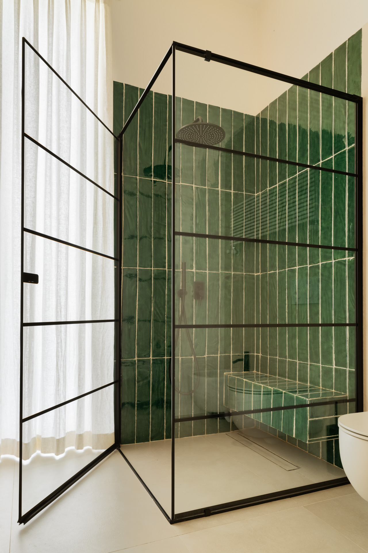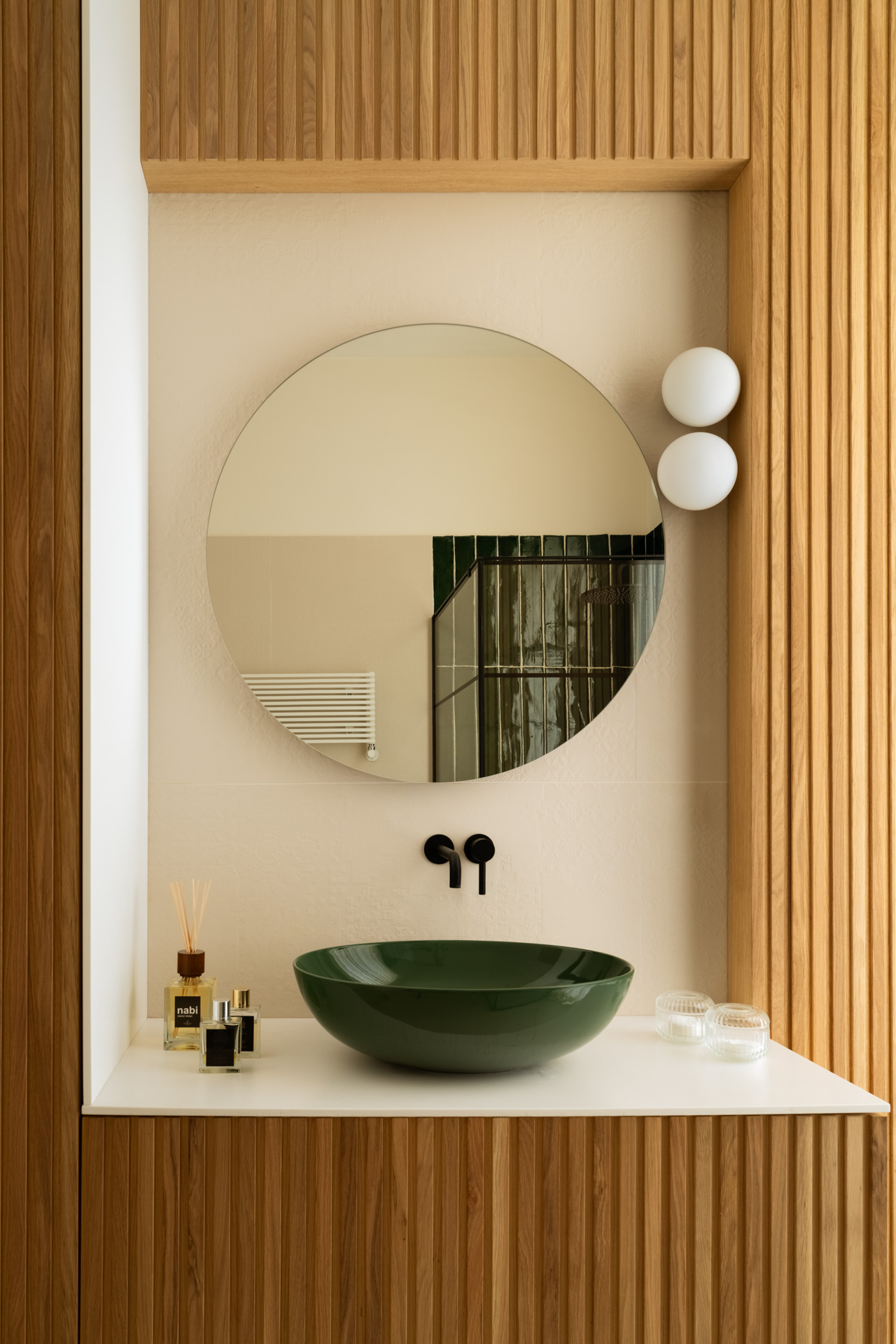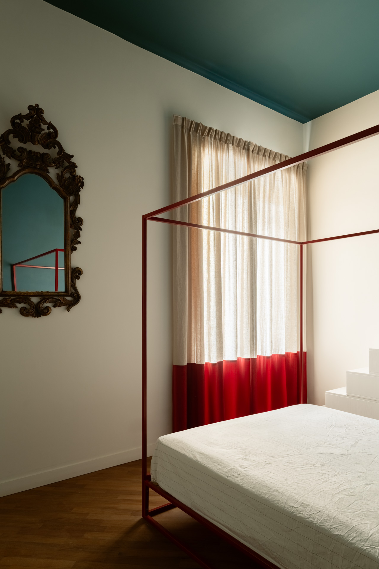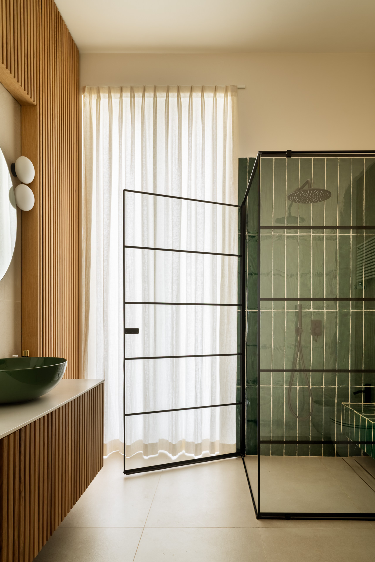 La prima camera da letto è un omaggio a Mykonos con il blu e l’onda del soppalco, un’opera di falegnameria total blue, che crea la capsula zona studio e racconta i viaggi estivi e spensierati della giovane padrona di casa. Completa questa prima area privata un bagno contemporaneo e funzionale con la nota materica delle mattonelle verdi Cottovietri e l’eleganza dei rivestimenti Dechirer di Patticia Urchiola per Mutina.