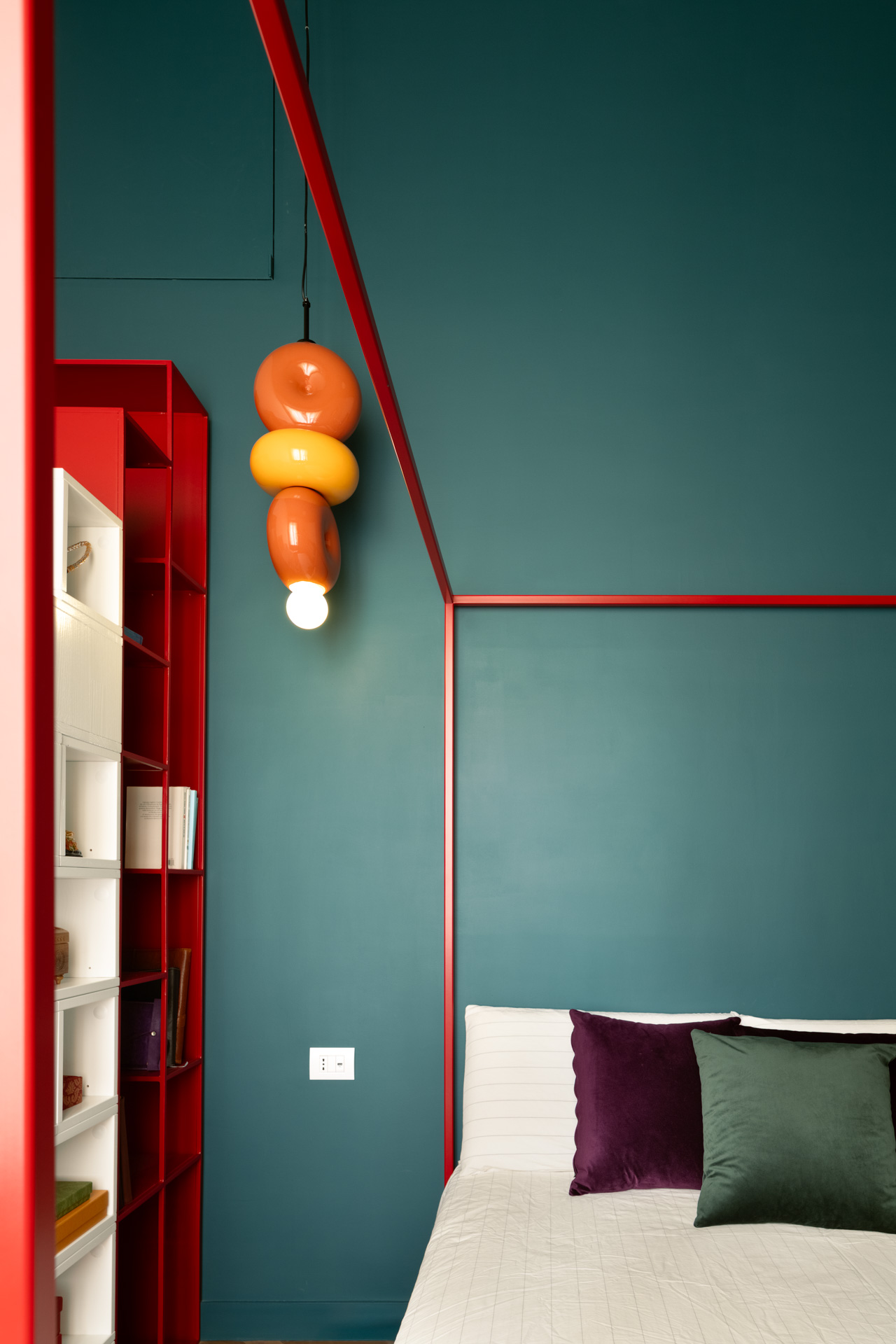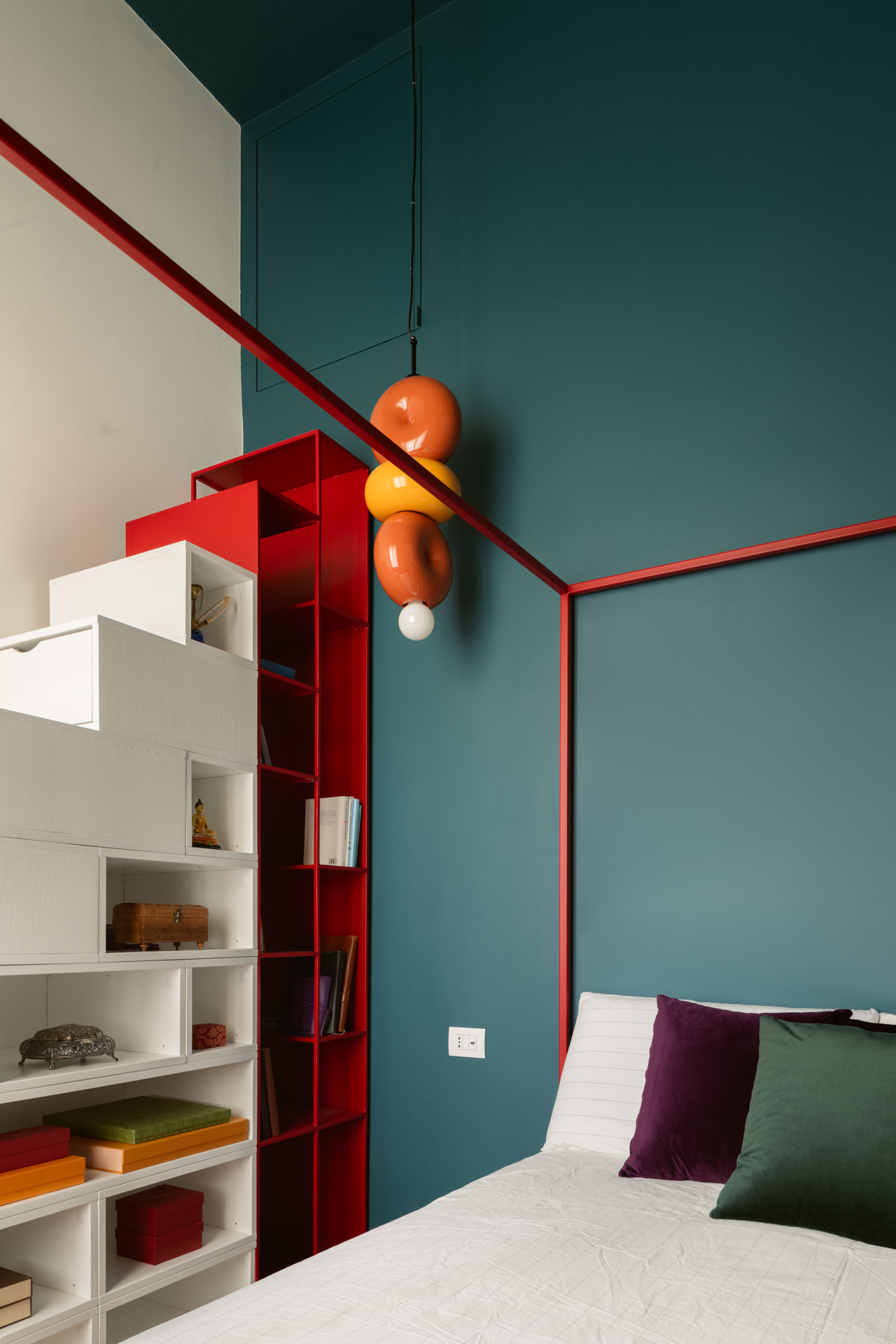 Marrakech nelle sue note avvolgenti si ritrova nella zona notte, dove colori e arredi formano un’alcova perfetta, e la scala libreria esprime la passione per la lettura della padrona di casa. Il bagno collegato alla camera è un Hammam dove rilassarsi e confortarsi.