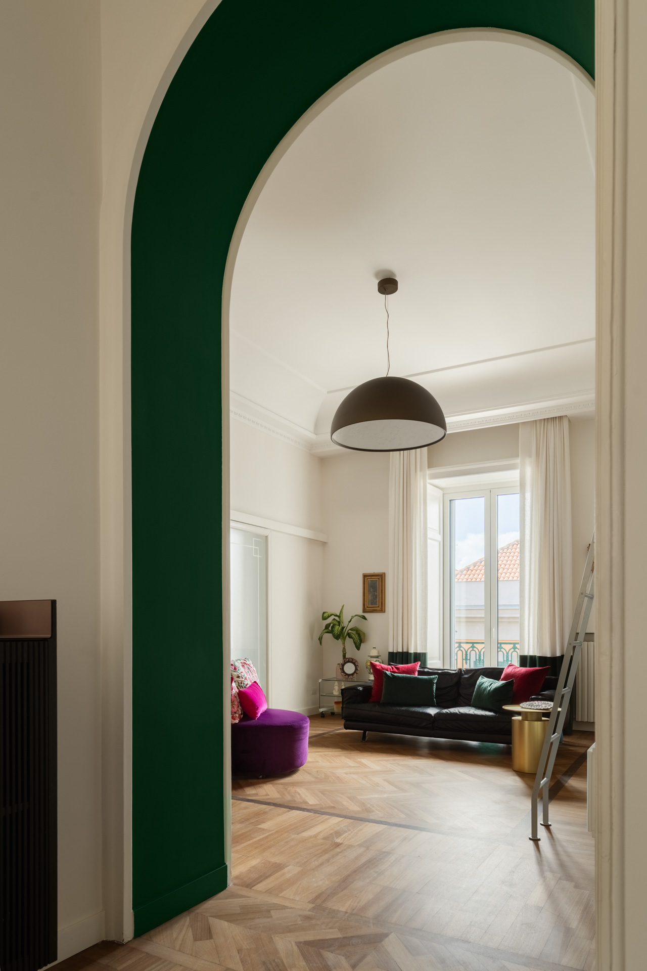 Ingresso, living e divisione dalla sala pranzo e dalla cucina rispettano la tradizione delle casa Napoletane, ma l’arredo si presenta innovativo e la presenza del colore sottolinea il passaggio di ambiente in ambiente.