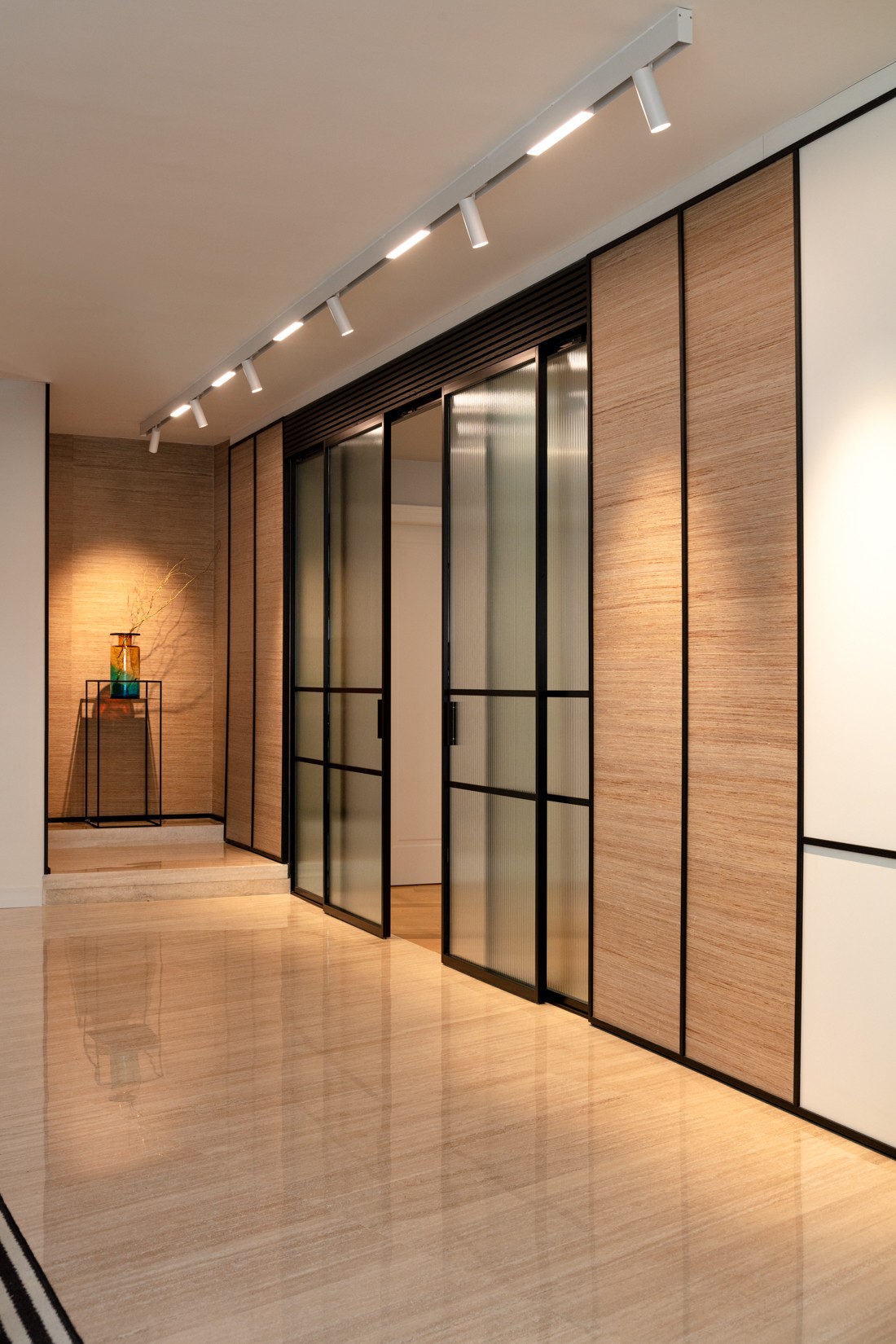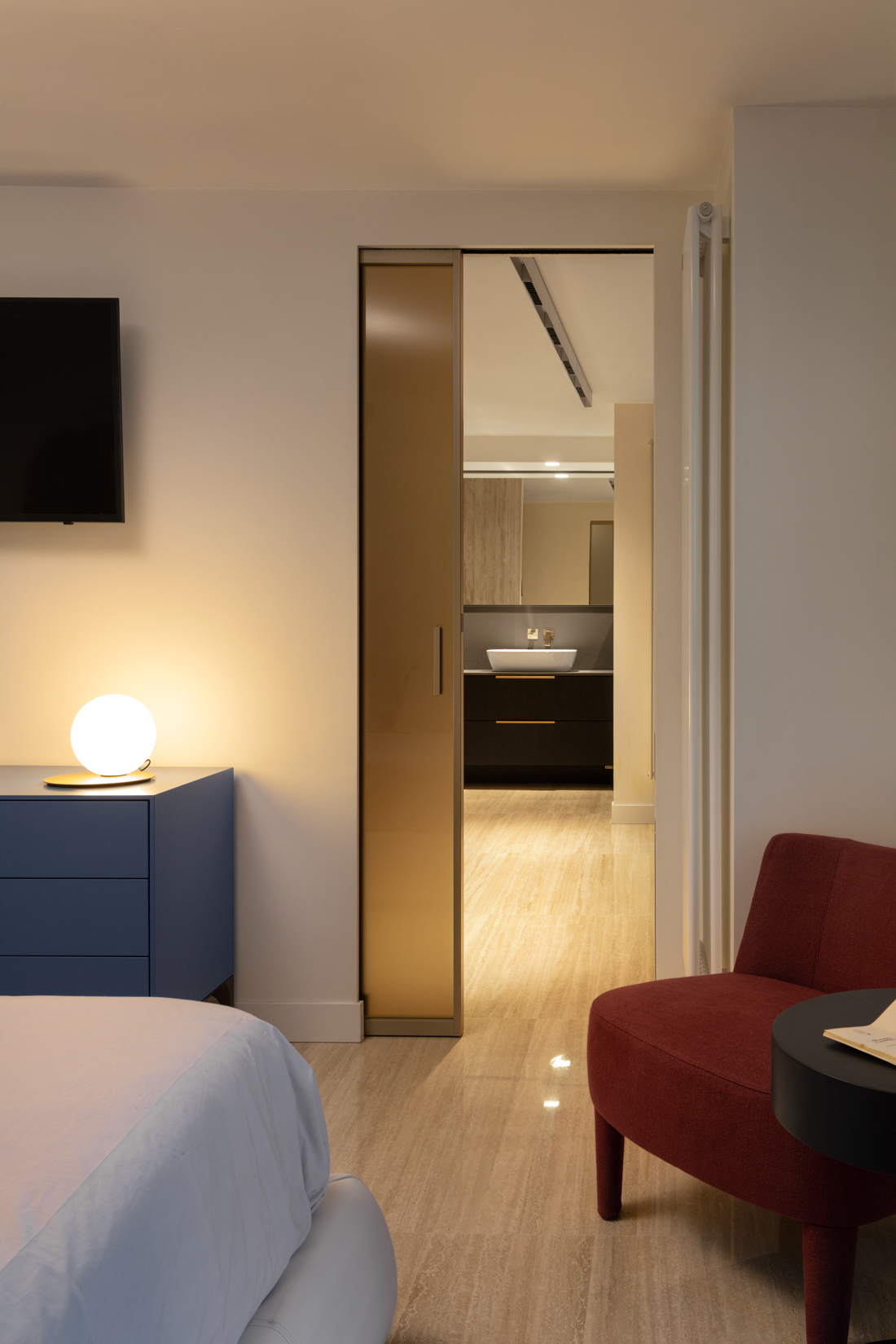 La master bed per i giovani genitori un rifugio dove – dalla zona del dormire attraverso un’ampia cabina armadio – si raggiunge un bagno in travertino e legno, quasi una spa dove ritrovare intimità ed energia.